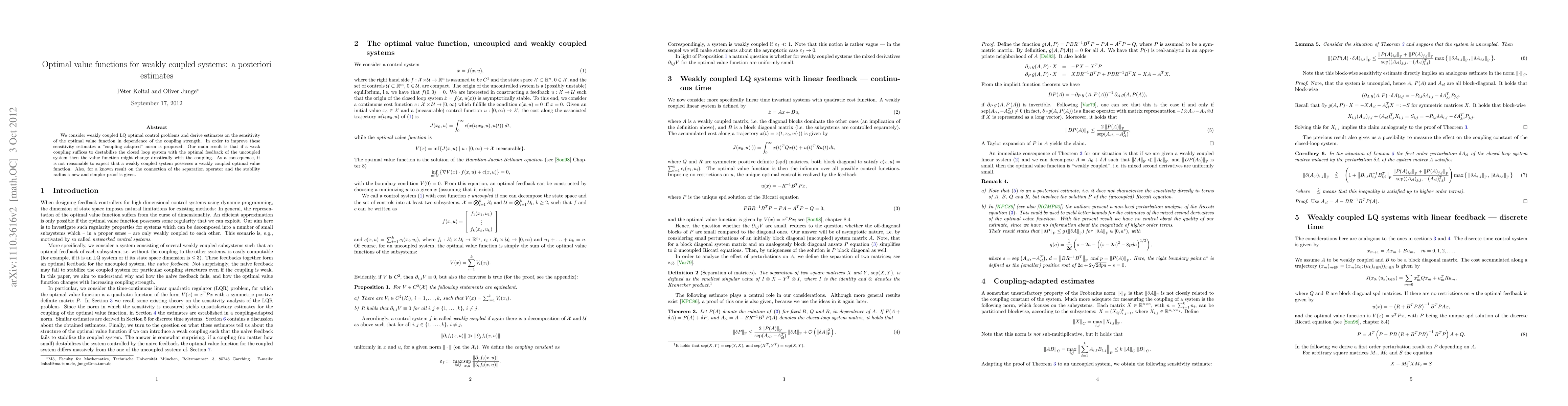 We consider weakly coupled LQ optimal control problems and derive estimates on the sensitivity of the optimal value function in dependence of the coupling strength. In order to improve these sensitivity estimates a "coupling adapted" norm is proposed. Our main result is that if a weak coupling suffices to destabilize the closed loop system with the optimal feedback of the uncoupled system then the value function might change drastically with the coupling. As a consequence, it is not reasonable to expect that a weakly coupled system possesses a weakly coupled optimal value function. Also, for a known result on the connection of the separation operator and the stability radius a new and simpler proof is given.