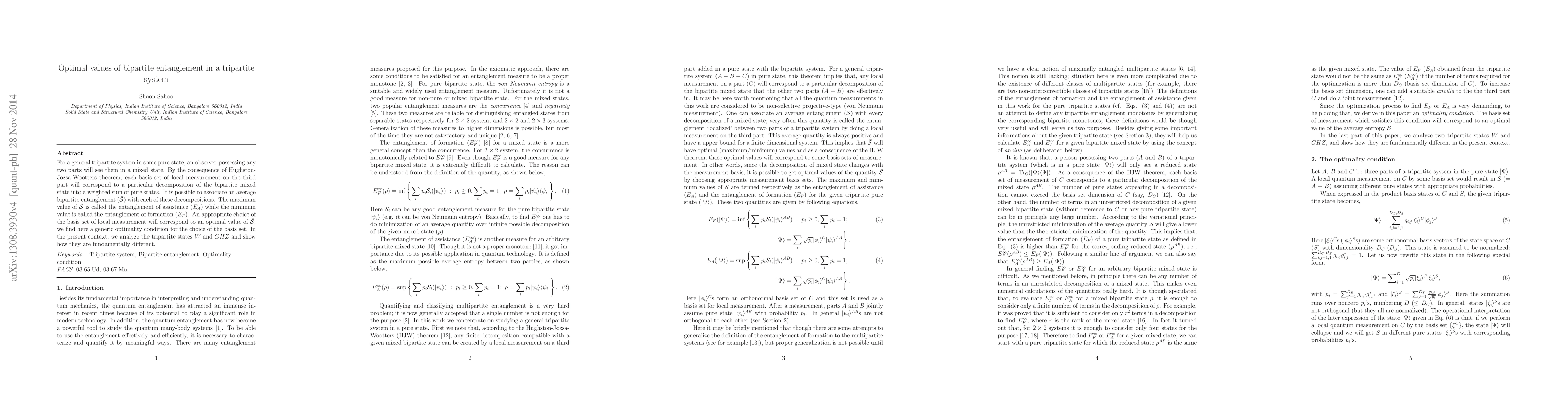 For a general tripartite system in some pure state, an observer possessing any two parts will see them in a mixed state. By the consequence of Hughston-Jozsa-Wootters theorem, each basis set of local measurement on the third part will correspond to a particular decomposition of the bipartite mixed state into a weighted sum of pure states. It is possible to associate an average bipartite entanglement ($\bar{\mathcal{S}}$) with each of these decompositions. The maximum value of $\bar{\mathcal{S}}$ is called the entanglement of assistance ($E_A$) while the minimum value is called the entanglement of formation ($E_F$). An appropriate choice of the basis set of local measurement will correspond to an optimal value of $\bar{\mathcal{S}}$; we find here a generic optimality condition for the choice of the basis set. In the present context, we analyze the tripartite states $W$ and $GHZ$ and show how they are fundamentally different.