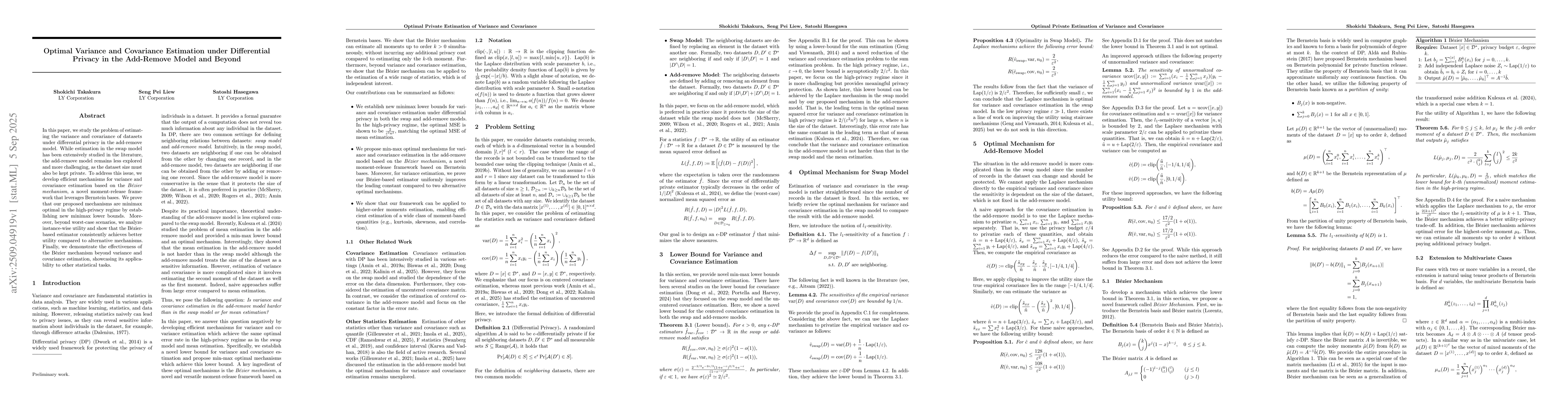 In this paper, we study the problem of estimating the variance and covariance of datasets under differential privacy in the add-remove model. While estimation in the swap model has been extensively studied in the literature, the add-remove model remains less explored and more challenging, as the dataset size must also be kept private. To address this issue, we develop efficient mechanisms for variance and covariance estimation based on the \emph{B\'{e}zier mechanism}, a novel moment-release framework that leverages Bernstein bases. We prove that our proposed mechanisms are minimax optimal in the high-privacy regime by establishing new minimax lower bounds. Moreover, beyond worst-case scenarios, we analyze instance-wise utility and show that the B\'{e}zier-based estimator consistently achieves better utility compared to alternative mechanisms. Finally, we demonstrate the effectiveness of the B\'{e}zier mechanism beyond variance and covariance estimation, showcasing its applicability to other statistical tasks.