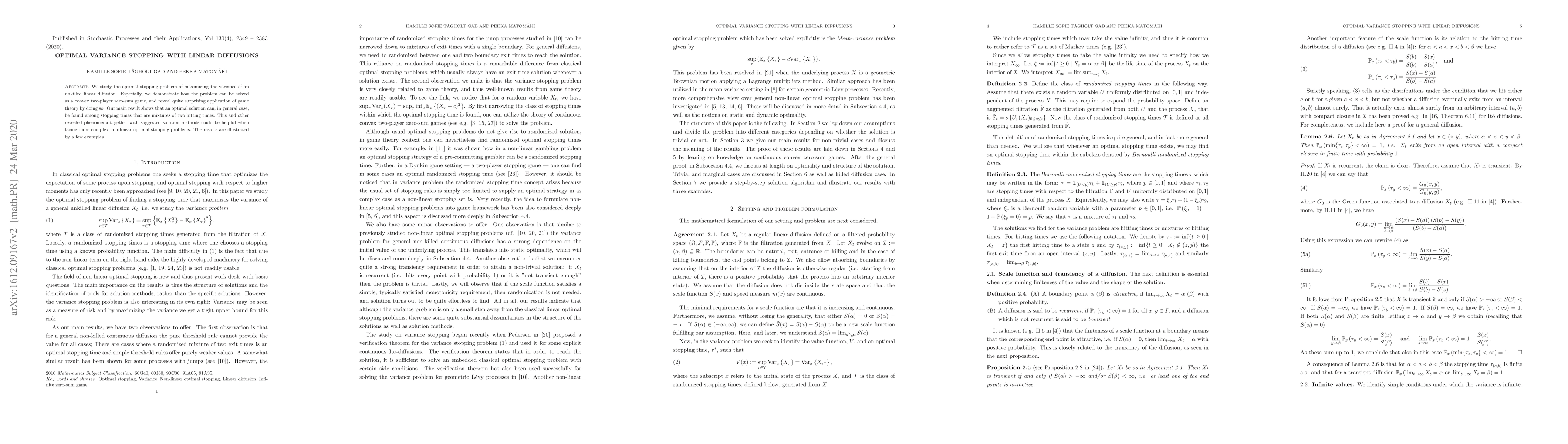 This paper explores the optimal stopping problem of maximizing the variance of a linear diffusion, framing it as a convex two-player zero-sum game. The authors demonstrate that optimal solutions often involve stopping times that are mixtures of two hitting times, providing insights and methods applicable to more complex non-linear problems.