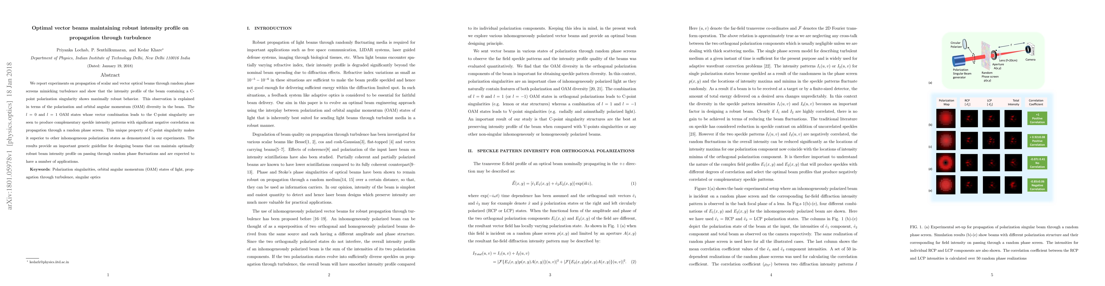 We report experiments on propagation of scalar and vector optical beams through random phase screens mimicking turbulence and show that the intensity profile of the beam containing a C-point polarization singularity shows maximally robust behavior. This observation is explained in terms of the polarization and orbital angular momentum (OAM) diversity in the beam. The $l = 0$ and $l = 1$ OAM states whose vector combination leads to the C-point singularity are seen to produce complementary speckle intensity patterns with significant negative correlation on propagation through a random phase screen. This unique property of C-point singularity makes it superior to other inhomogeneous polarization states as demonstrated in our experiments. The results provide an important generic guideline for designing beams that can maintain optimally robust beam intensity profile on passing through random phase fluctuations and are expected to have a number of applications.