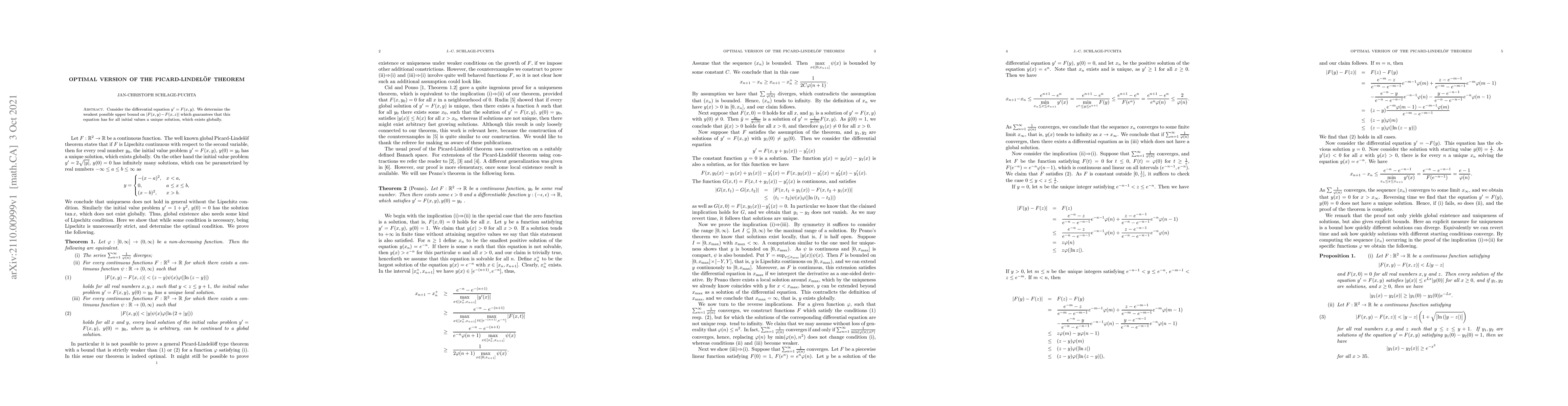 Consider the differential equation $y'=F(x,y)$. We determine the weakest possible upper bound on $|F(x,y)-F(x,z)|$ which guarantees that this equation has for all initial values a unique solution, which exists globally.