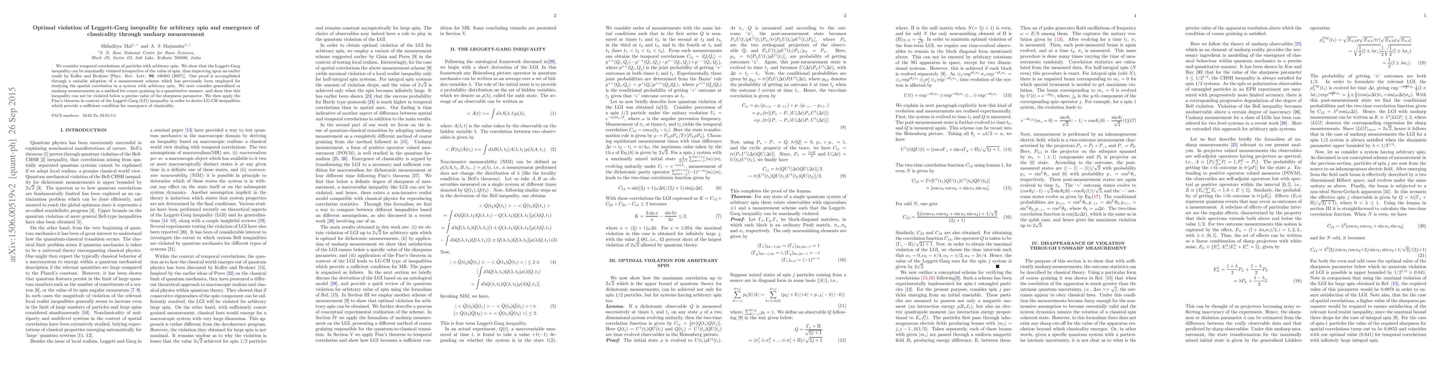 This paper demonstrates the optimal violation of the Leggett-Garg inequality for particles of any spin, surpassing previous results, and employs unsharp measurements to reveal the emergence of classicality linked to macroscopic realism. The study uses a tailored measurement scheme and shows that classicality emerges when the sharpness parameter falls below a specific threshold.