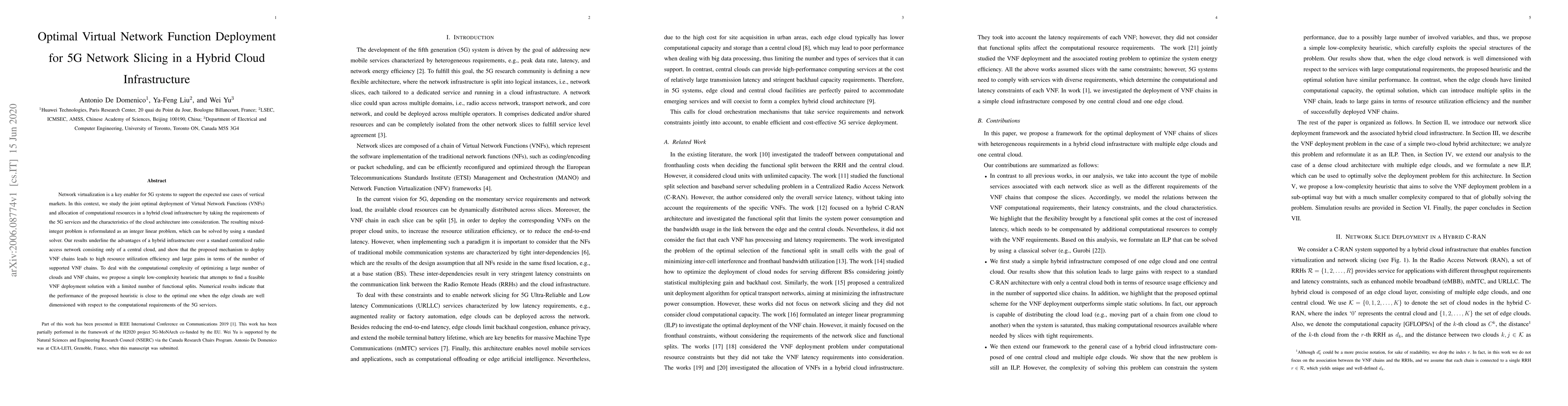 Network virtualization is a key enabler for 5G systems to support the expected use cases of vertical markets. In this context, we study the joint optimal deployment of Virtual Network Functions (VNFs) and allocation of computational resources in a hybrid cloud infrastructure by taking the requirements of the 5G services and the characteristics of the cloud architecture into consideration. The resulting mixed-integer problem is reformulated as an integer linear problem, which can be solved by using a standard solver. Our results underline the advantages of a hybrid infrastructure over a standard centralized radio access network consisting only of a central cloud, and show that the proposed mechanism to deploy VNF chains leads to high resource utilization efficiency and large gains in terms of the number of supported VNF chains. To deal with the computational complexity of optimizing a large number of clouds and VNF chains, we propose a simple low-complexity heuristic that attempts to find a feasible VNF deployment solution with a limited number of functional splits. Numerical results indicate that the performance of the proposed heuristic is close to the optimal one when the edge clouds are well dimensioned with respect to the computational requirements of the 5G services.