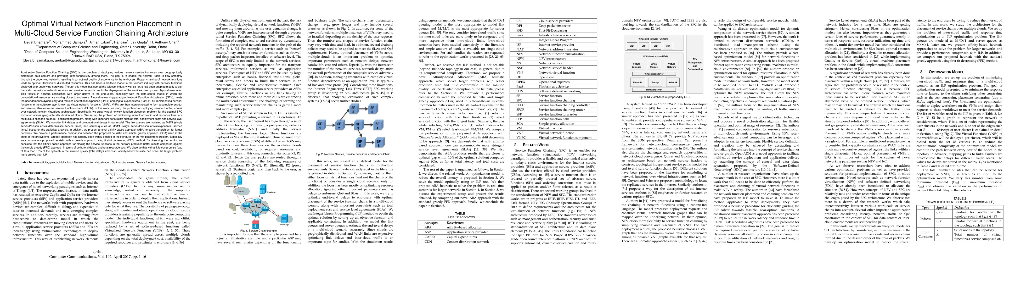 Service Function Chaining (SFC) is the problem of deploying various network service instances over geographically distributed data centers and providing inter-connectivity among them. The goal is to enable the network traffic to flow smoothly through the underlying network, resulting in an optimal quality of experience to the end-users. Proper chaining of network functions leads to optimal utilization of distributed resources. This has been a de-facto model in the telecom industry with network functions deployed over underlying hardware. Though this model has served the telecom industry well so far, it has been adapted mostly to suit the static behavior of network services and service demands due to the deployment of the services directly over physical resources. This results in network ossification with larger delays to the end-users, especially with the data-centric model in which the computational resources are moving closer to end users. A novel networking paradigm, Network Function Virtualization (NFV), meets the user demands dynamically and reduces operational expenses (OpEx) and capital expenditures (CapEx), by implementing network functions in the software layer known as virtual network functions (VNFs). VNFs are then interconnected to form a complete end-to-end service, also known as service function chains (SFCs). In this work, we study the problem of deploying service function chains over network function virtualized architecture. Specifically, we study virtual network function placement problem for the optimal SFC formation across geographically distributed clouds. We set up the problem of minimizing inter-cloud traffic and response time in a multi-cloud scenario as an ILP optimization problem, along with important constraints such as total deployment costs and service level agreements (SLAs). We consider link delays and computational delays in our model.