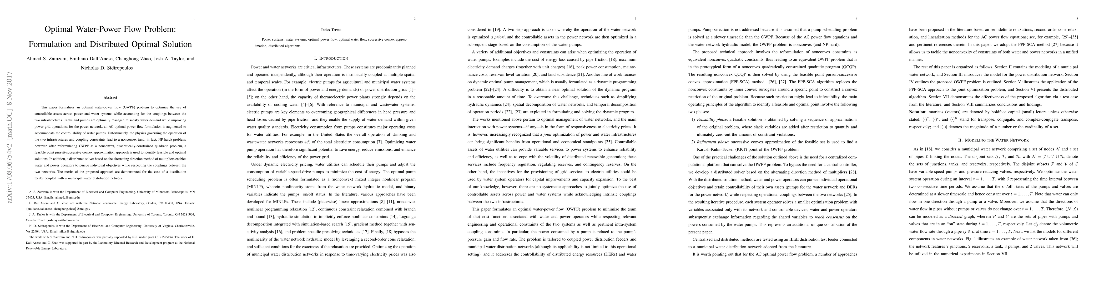 This paper formulates an optimal water-power flow problem to optimize the integration of power and water systems, addressing nonconvexity through reformulation and a successive convex approximation approach. A distributed solver using the alternating direction method of multipliers is proposed to enable cooperative optimization while respecting inter-network constraints.