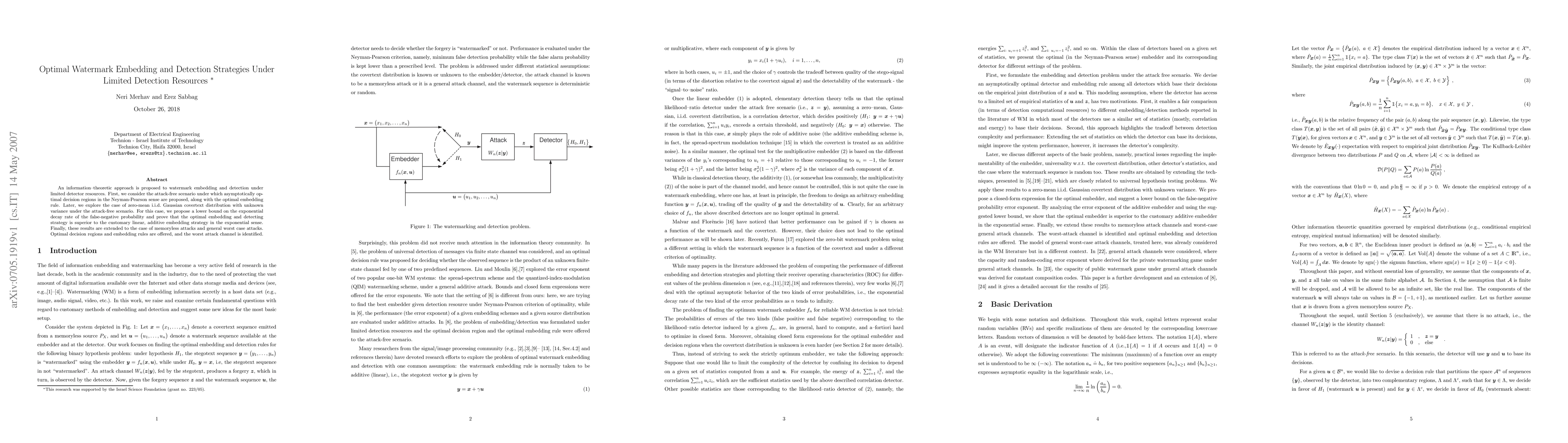 This paper proposes an information-theoretic framework for optimal watermark embedding and detection under resource constraints. It introduces optimal strategies for both attack-free and memoryless attack scenarios, demonstrating superior performance over traditional linear embedding methods.