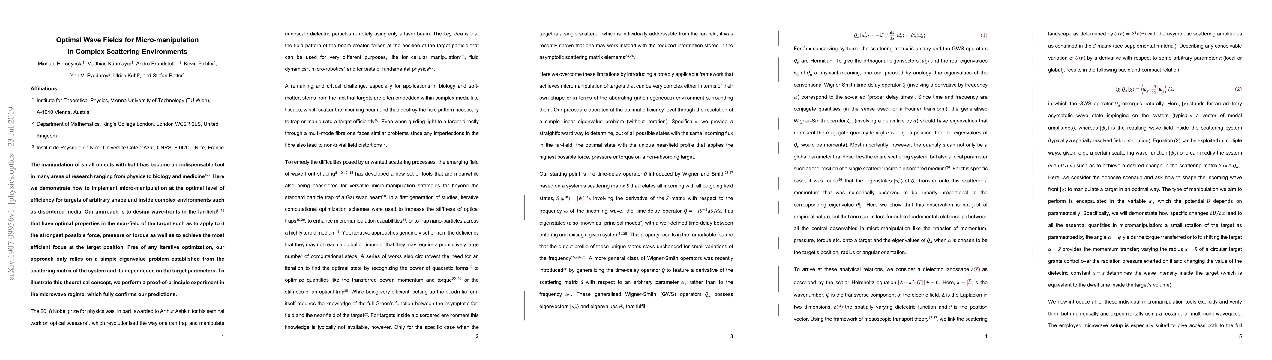 The manipulation of small objects with light has become an indispensable tool in many areas of research ranging from physics to biology and medicine. Here we demonstrate how to implement micro-manipulation at the optimal level of efficiency for targets of arbitrary shape and inside complex environments such as disordered media. Our approach is to design wave-fronts in the far-field that have optimal properties in the near-field of the target such as to apply to it the strongest possible force, pressure or torque as well as to achieve the most efficient focus at the target position. Free of any iterative optimization, our approach only relies on a simple eigenvalue problem established from the scattering matrix of the system and its dependence on the target parameters. To illustrate this theoretical concept, we perform a proof-of-principle experiment in the microwave regime, which fully confirms our predictions.