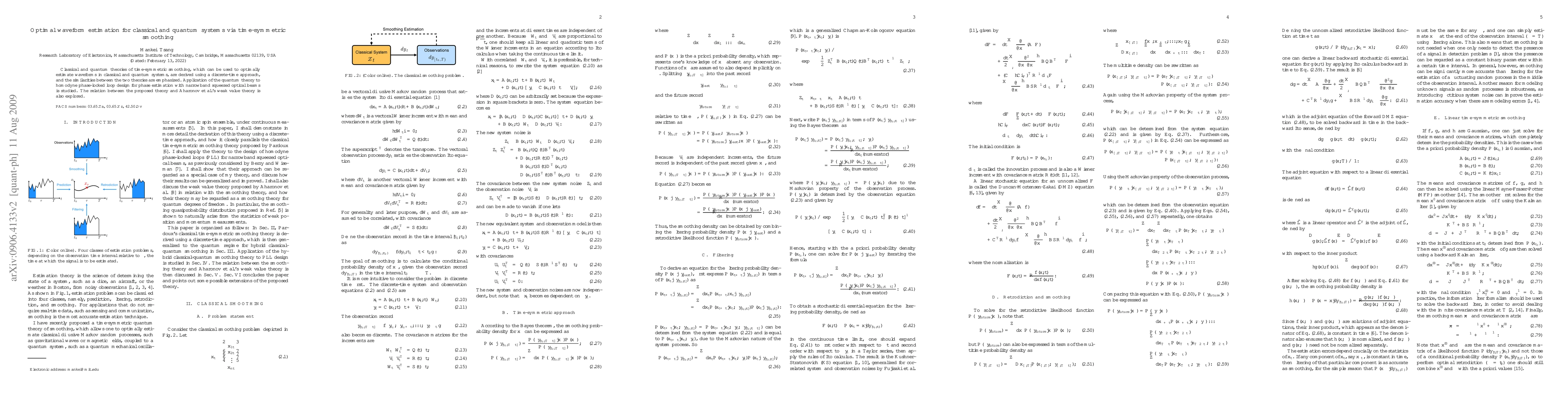 This paper derives time-symmetric smoothing theories for both classical and quantum systems to optimally estimate waveforms, highlighting their similarities. It applies the quantum theory to phase estimation in squeezed optical beams and discusses its relation to Aharonov et al.'s weak value theory.