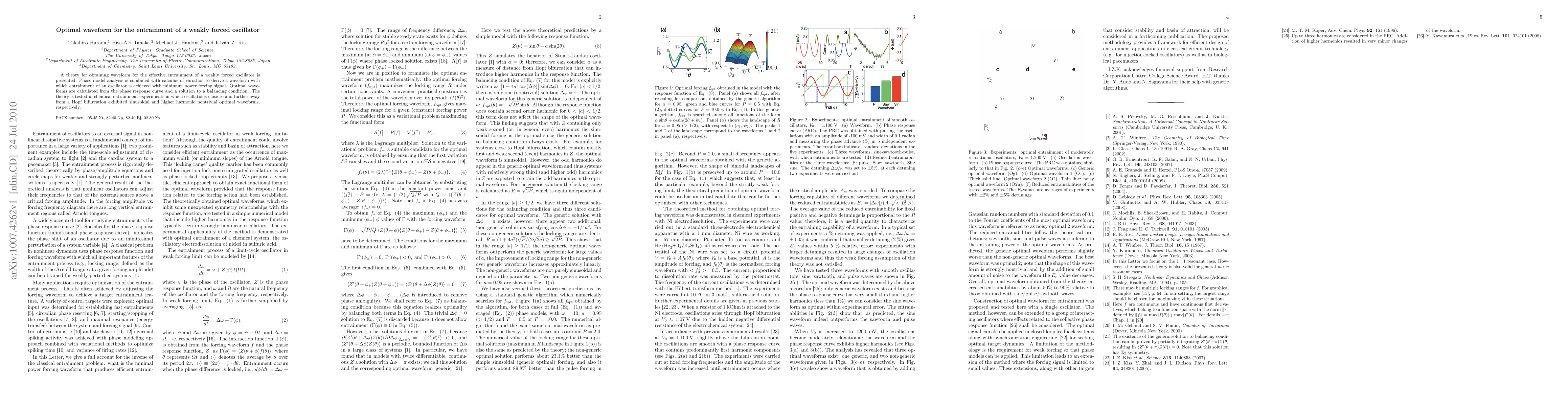 This paper presents a theory for deriving optimal waveforms that effectively entrain weakly forced oscillators with minimal power, combining phase model analysis and calculus of variation. Experimental results in chemical systems demonstrate sinusoidal and higher harmonic optimal waveforms near and far from a Hopf bifurcation, respectively.