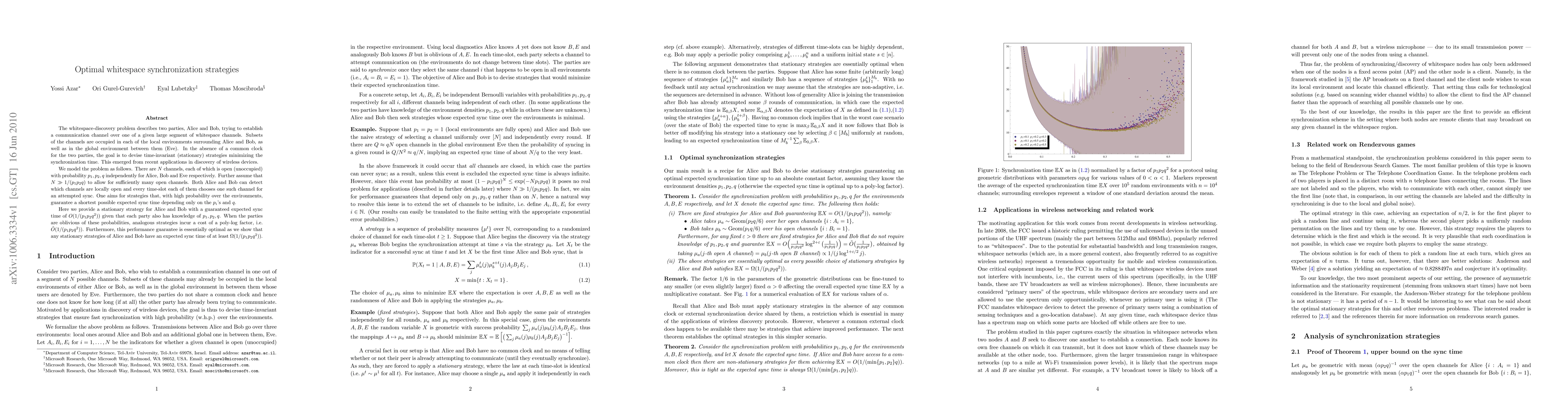 The whitespace-discovery problem describes two parties, Alice and Bob, trying to establish a communication channel over one of a given large segment of whitespace channels. Subsets of the channels are occupied in each of the local environments surrounding Alice and Bob, as well as in the global environment between them (Eve). In the absence of a common clock for the two parties, the goal is to devise time-invariant (stationary) strategies minimizing the synchronization time. This emerged from recent applications in discovery of wireless devices. We model the problem as follows. There are $N$ channels, each of which is open (unoccupied) with probability $p_1,p_2,q$ independently for Alice, Bob and Eve respectively. Further assume that $N \gg 1/(p_1 p_2 q)$ to allow for sufficiently many open channels. Both Alice and Bob can detect which channels are locally open and every time-slot each of them chooses one such channel for an attempted sync. One aims for strategies that, with high probability over the environments, guarantee a shortest possible expected sync time depending only on the $p_i$'s and $q$. Here we provide a stationary strategy for Alice and Bob with a guaranteed expected sync time of $O(1 / (p_1 p_2 q^2))$ given that each party also has knowledge of $p_1,p_2,q$. When the parties are oblivious of these probabilities, analogous strategies incur a cost of a poly-log factor, i.e.\ $\tilde{O}(1 / (p_1 p_2 q^2))$. Furthermore, this performance guarantee is essentially optimal as we show that any stationary strategies of Alice and Bob have an expected sync time of at least $\Omega(1/(p_1 p_2 q^2))$.