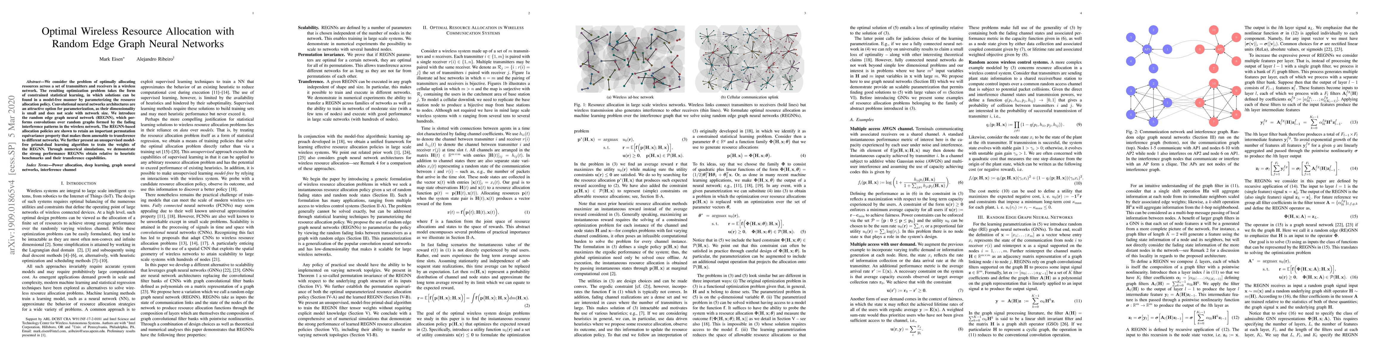 This paper proposes a random edge graph neural network (REGNN) for optimal wireless resource allocation in networks, leveraging convolutional neural networks' scalability. The REGNN maintains permutation equivariance, enabling efficient transfer to different networks, and demonstrates superior performance and transference capabilities compared to heuristic benchmarks.