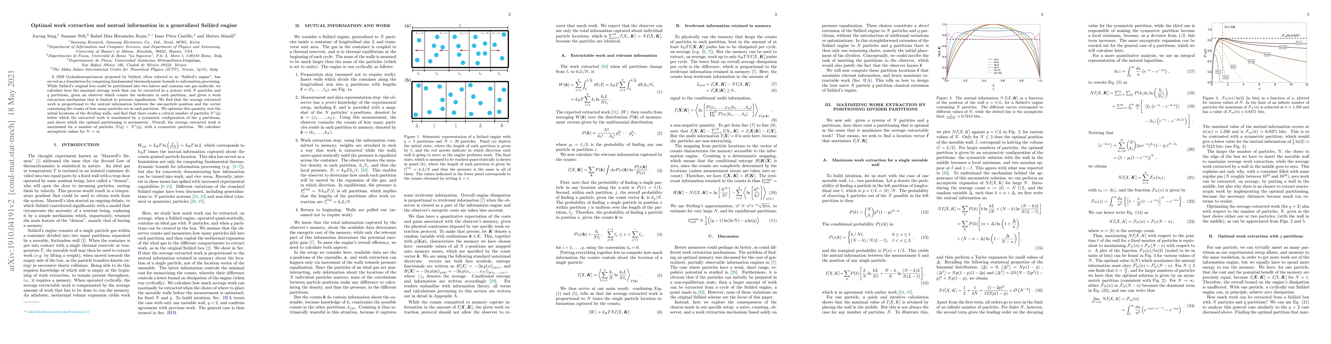 This paper investigates the optimal work extraction in a generalized Szilárd engine with $N$ particles and $q$ partitions, determining the maximal average work based on mutual information. The study finds that the extracted work is maximized by a symmetric configuration for a critical number of particles $N^{\star}(q)$, with an optimal partition yielding maximum work for $\hat{N}(q) < N^{\star}(q)$.