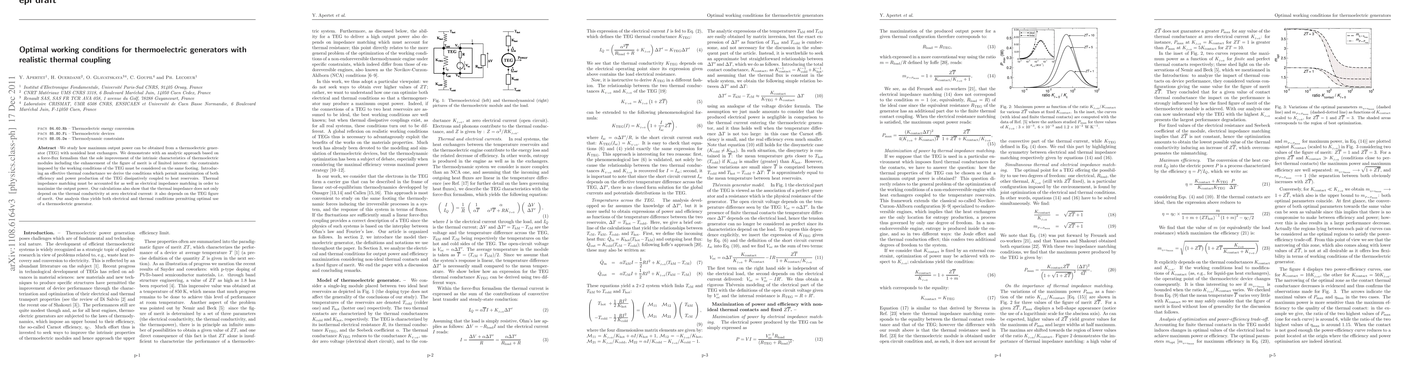 This paper explores optimal working conditions for thermoelectric generators (TEGs) with realistic thermal coupling, demonstrating that maximizing efficiency and power production requires considering both thermal and electrical impedance matching, alongside intrinsic thermoelectric module characteristics. The study reveals that thermal impedance is influenced by both the TEG figure of merit and operational conditions.