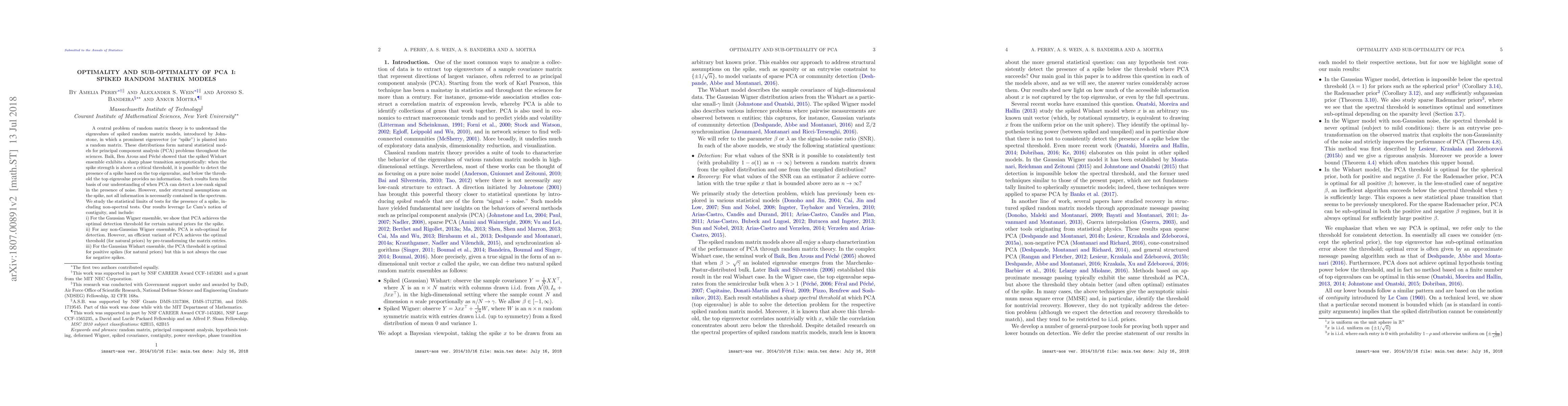 This paper investigates the optimality of PCA in detecting a "spiked" signal in random matrix models, showing that PCA achieves optimal detection thresholds for Gaussian Wigner ensembles under certain priors. For non-Gaussian Wigner ensembles, PCA is sub-optimal, but an efficient variant using matrix entry transformation can achieve optimal thresholds. In Gaussian Wishart ensembles, PCA is optimal for positive spikes but not necessarily for negative spikes.