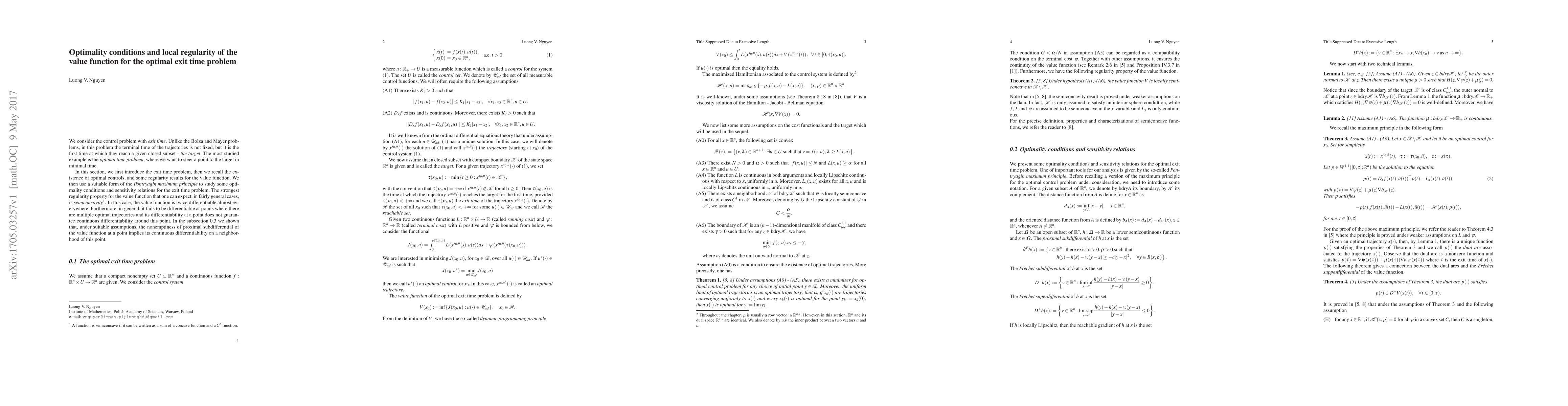 This paper investigates the optimal exit time problem, where the goal is to reach a target in minimal time by varying the terminal time. It explores optimality conditions and local regularity of the value function, proving semiconcavity and establishing conditions under which the value function is continuously differentiable.