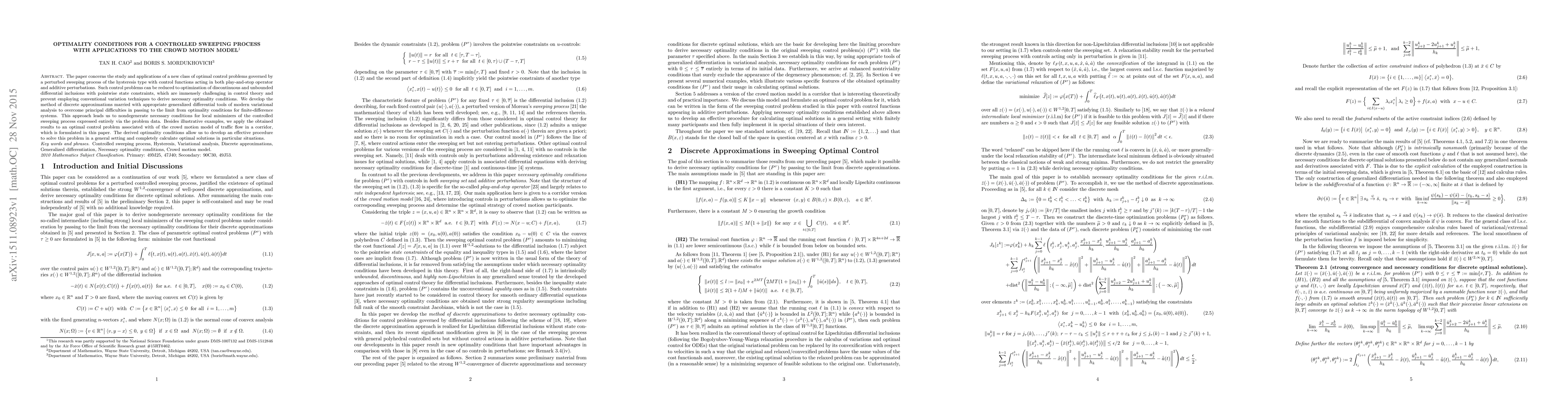 The paper concerns the study and applications of a new class of optimal control problems governed by a perturbed sweeping process of the hysteresis type with control functions acting in both play-and-stop operator and additive perturbations. Such control problems can be reduced to optimization of discontinuous and unbounded differential inclusions with pointwise state constraints, which are immensely challenging in control theory and prevent employing conventional variation techniques to derive necessary optimality conditions. We develop the method of discrete approximations married with appropriate generalized differential tools of modern variational analysis to overcome principal difficulties in passing to the limit from optimality conditions for finite-difference systems. This approach leads us to nondegenerate necessary conditions for local minimizers of the controlled sweeping process expressed entirely via the problem data. Besides illustrative examples, we apply the obtained results to an optimal control problem associated with of the crowd motion model of traffic flow in a corridor, which is formulated in this paper. The derived optimality conditions allow us to develop an effective procedure to solve this problem in a general setting and completely calculate optimal solutions in particular situations.