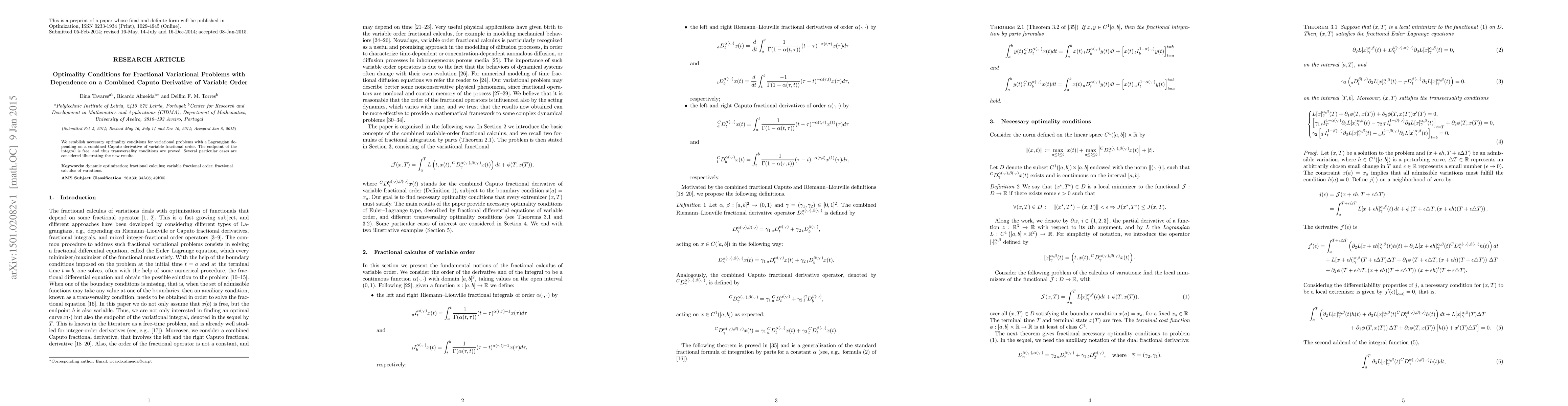 This paper establishes necessary optimality conditions for fractional variational problems involving a combined Caputo derivative of variable order, with a free endpoint, and proves the corresponding transversality conditions. Several specific cases are analyzed to demonstrate the application of the new results.