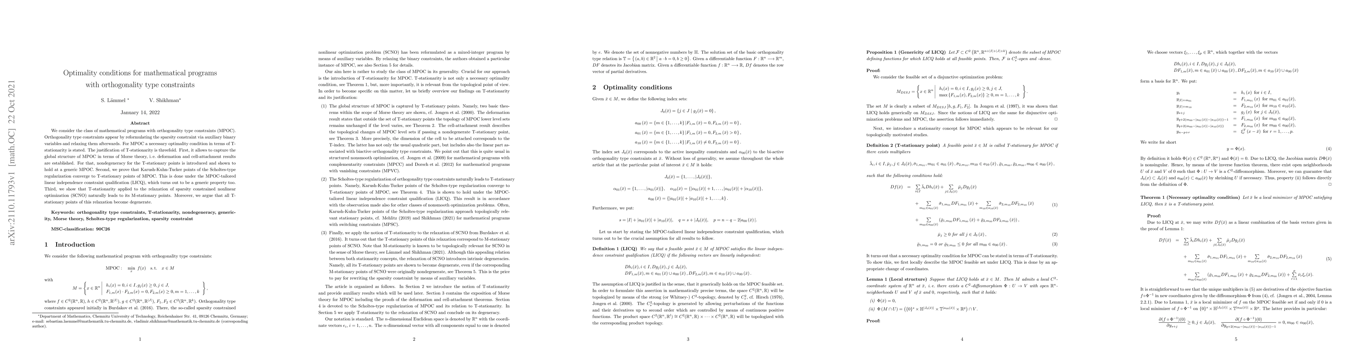 We consider the class of mathematical programs with orthogonality type constraints (MPOC). Orthogonality type constraints appear by reformulating the sparsity constraint via auxiliary binary variables and relaxing them afterwards. For MPOC a necessary optimality condition in terms of T-stationarity is stated. The justification of T-stationarity is threefold. First, it allows to capture the global structure of MPOC in terms of Morse theory, i. e. deformation and cell-attachment results are established. For that, nondegeneracy for the T-stationary points is introduced and shown to hold at a generic MPOC. Second, we prove that Karush-Kuhn-Tucker points of the Scholtes-type regularization converge to T-stationary points of MPOC. This is done under the MPOC-tailored linear independence constraint qualification (LICQ), which turns out to be a generic property too. Third, we show that T-stationarity applied to the relaxation of sparsity constrained nonlinear optimization (SCNO) naturally leads to its M-stationary points. Moreover, we argue that all T-stationary points of this relaxation become degenerate.