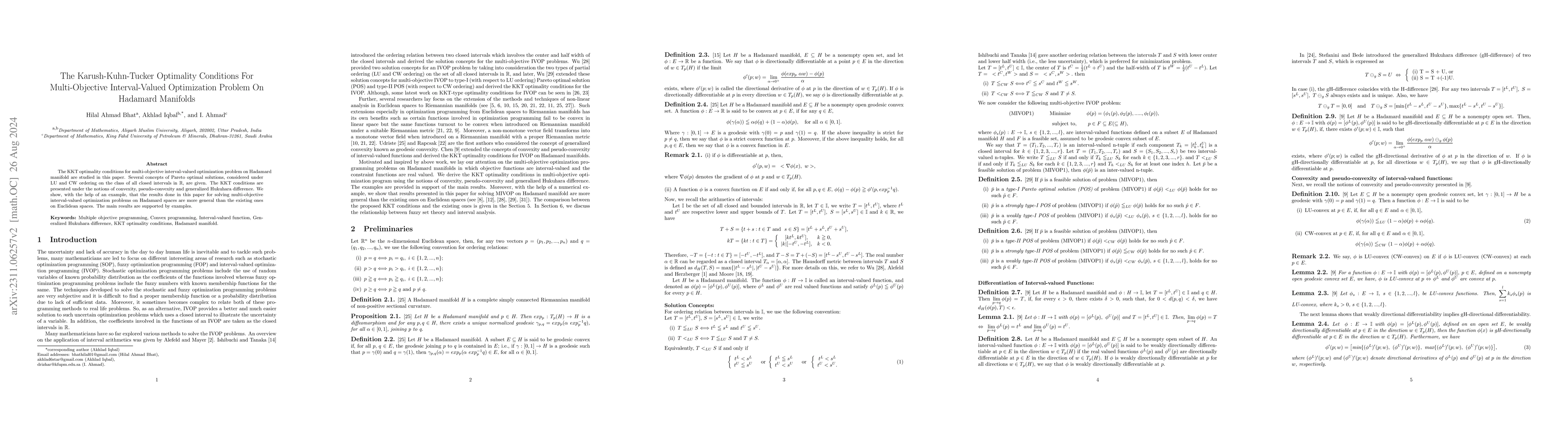 This paper studies KKT optimality conditions for multi-objective interval-valued optimization on Hadamard manifolds, introducing Pareto optimal solutions under LU and CW ordering. It presents KKT conditions under convexity, pseudo-convexity, and generalized Hukuhara difference, demonstrating their generality over existing Euclidean space results with examples.