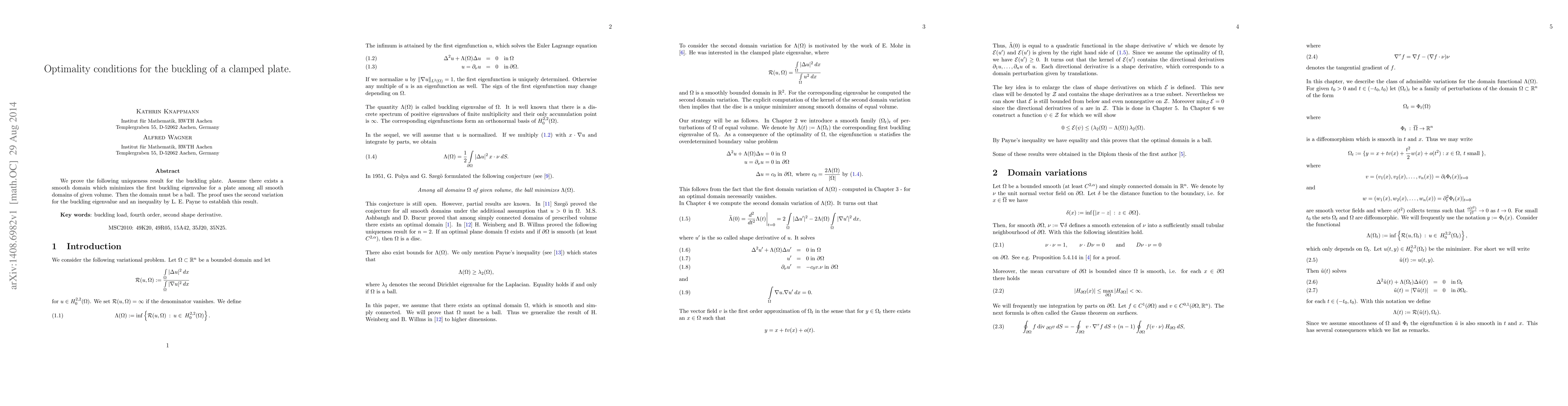 We prove the following uniqueness result for the buckling plate. Assume there exists a smooth domain which minimizes the first buckling eigenvalue for a plate among all smooth domains of given volume. Then the domain must be a ball. The proof uses the second variation for the buckling eigenvalue and an inequality by L. E. Payne to establish this result.
