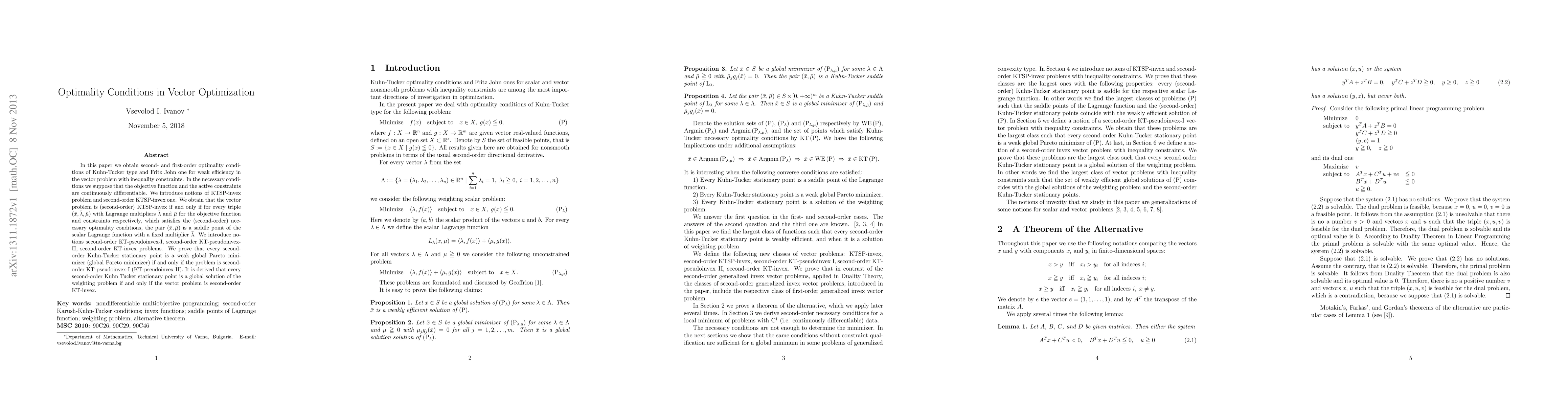 In this paper we obtain second- and first-order optimality conditions of Kuhn-Tucker type and Fritz John one for weak efficiency in the vector problem with inequality constraints. In the necessary conditions we suppose that the objective function and the active constraints are continuously differentiable. We introduce notions of KTSP-invex problem and second-order KTSP-invex one. We obtain that the vector problem is (second-order) KTSP-invex if and only if for every triple $(\bar x,\bar\lambda,\bar\mu)$ with Lagrange multipliers $\bar\lambda$ and $\bar\mu$ for the objective function and constraints respectively, which satisfies the (second-order) necessary optimality conditions, the pair $(\bar x,\bar\mu)$ is a saddle point of the scalar Lagrange function with a fixed multiplier $\bar\lambda$. We introduce notions second-order KT-pseudoinvex-I, second-order KT-pseudo\-invex-II, second-order KT-invex problems. We prove that every second-order Kuhn-Tucker stationary point is a weak global Pareto minimizer (global Pareto minimizer) if and only if the problem is second-order KT-pseudoinvex-I (KT-pseudoinvex-II). It is derived that every second-order Kuhn Tucker stationary point is a global solution of the weighting problem if and only if the vector problem is second-order KT-invex.