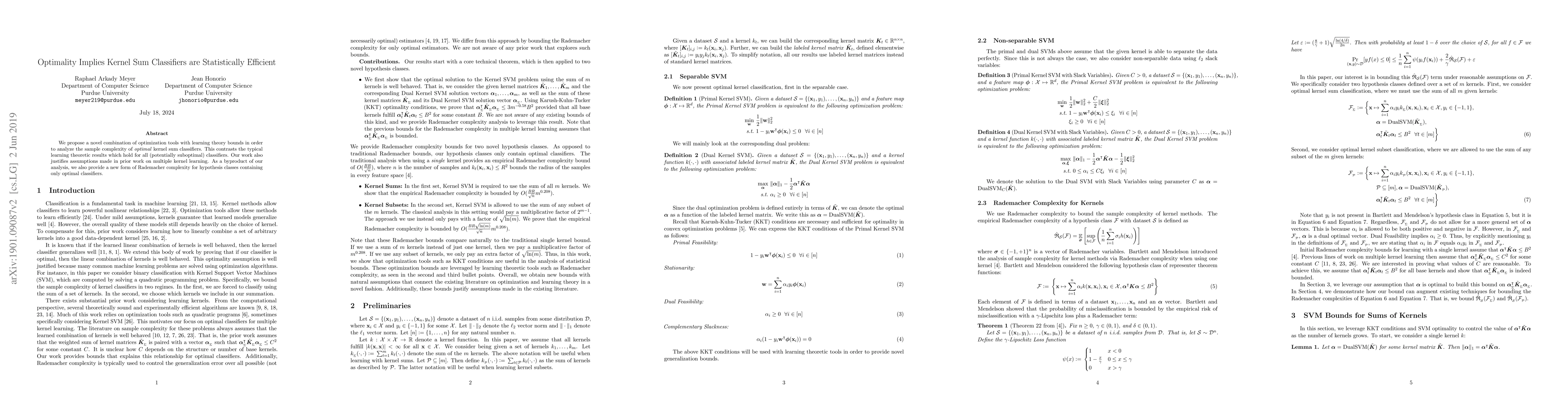 This paper combines optimization tools with learning theory to analyze the sample complexity of optimal kernel sum classifiers, demonstrating their statistical efficiency and justifying assumptions in prior multiple kernel learning work. It also introduces a new form of Rademacher complexity for hypothesis classes with optimal classifiers.