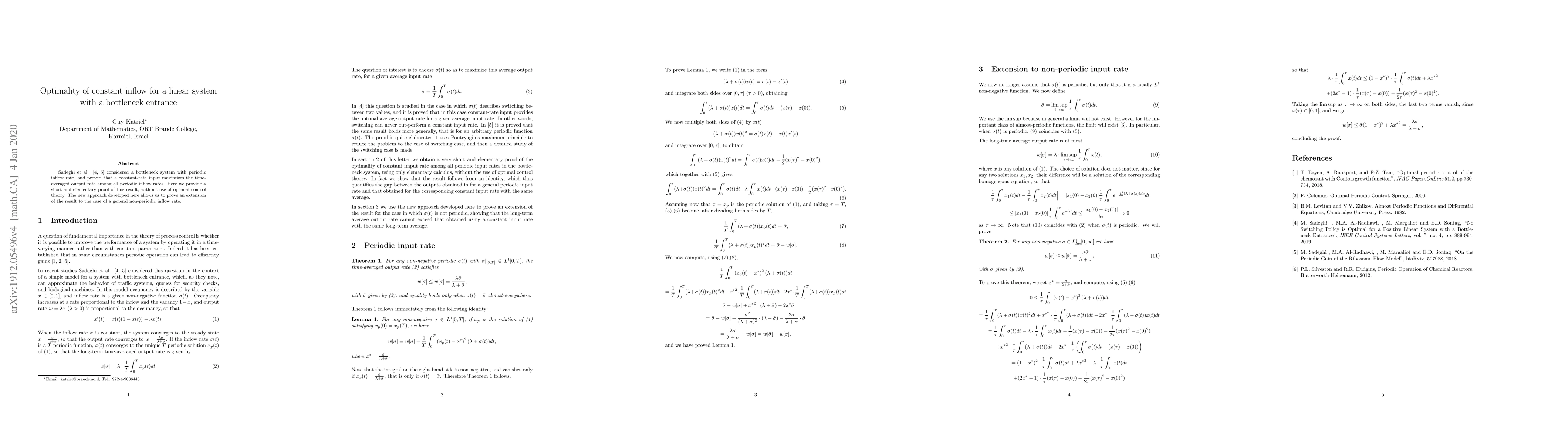 A study proves that a constant inflow rate maximizes output rate in linear systems with bottlenecks, extending the result to non-periodic inflow rates.