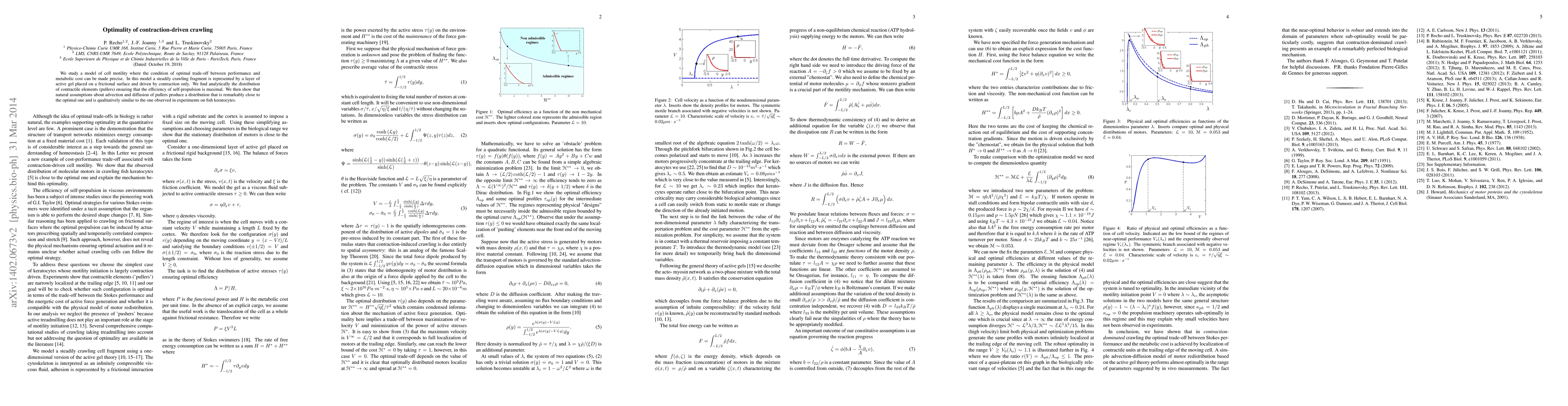 We study a model of cell motility where the condition of optimal trade-off between performance and metabolic cost can be made precise. In this model a steadily crawling fragment is represented by a layer of active gel placed on a frictional surface and driven by contraction only. We find analytically the distribution of contractile elements (pullers) ensuring that the efficiency of self-propulsion is maximal. We then show that natural assumptions about advection and diffusion of pullers produce a distribution that is remarkably close to the optimal one and is qualitatively similar to the one observed in experiments on fish keratocytes.