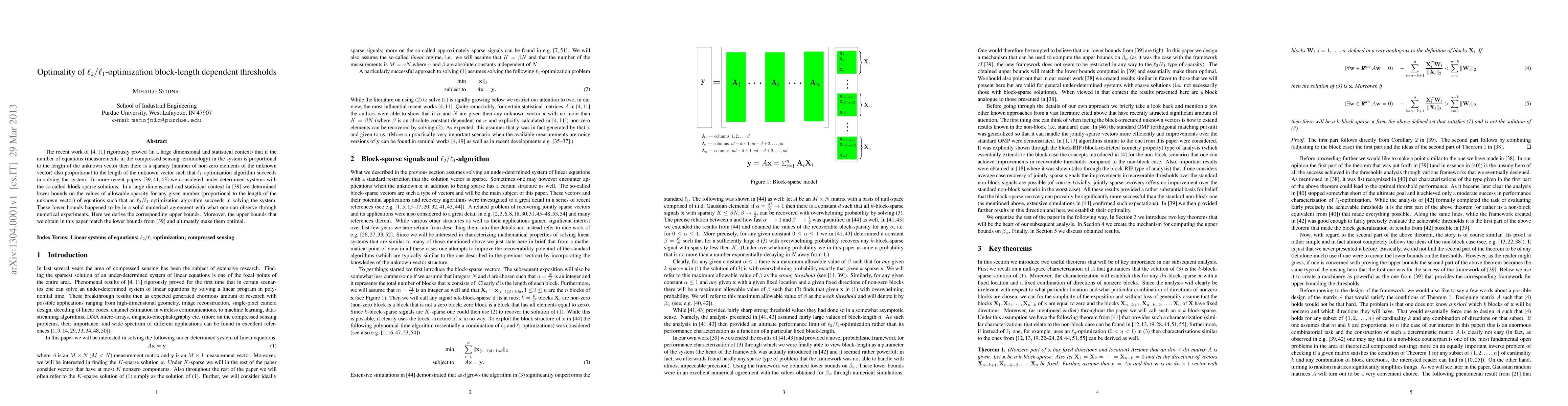 This paper derives upper bounds for $ extit{block}- extit{sparse}$ solutions in under-determined systems, showing that $ extit{ell}_2/ extit{ell}_1$-optimization algorithms succeed with optimal thresholds based on the length of the unknown vector.
