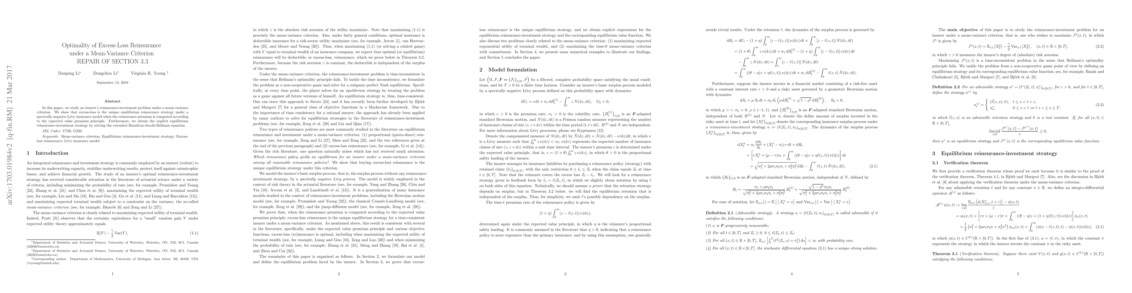 This paper investigates an insurer's reinsurance-investment problem under a mean-variance criterion, demonstrating that excess-loss reinsurance is the optimal strategy in a spectrally negative Lévy insurance model when premiums are based on expected value. The optimal reinsurance-investment strategy is derived by solving the extended Hamilton-Jacobi-Bellman equation.