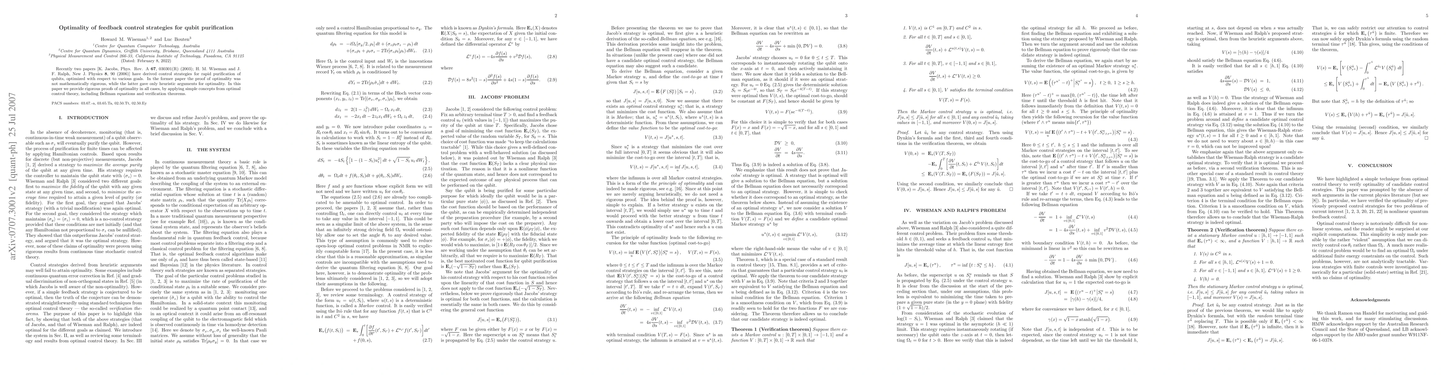 This paper rigorously proves the optimality of feedback control strategies for qubit purification, addressing previous lack of mathematical rigor and heuristic arguments in earlier works. It utilizes optimal control theory concepts such as Bellman equations and verification theorems to achieve these proofs.