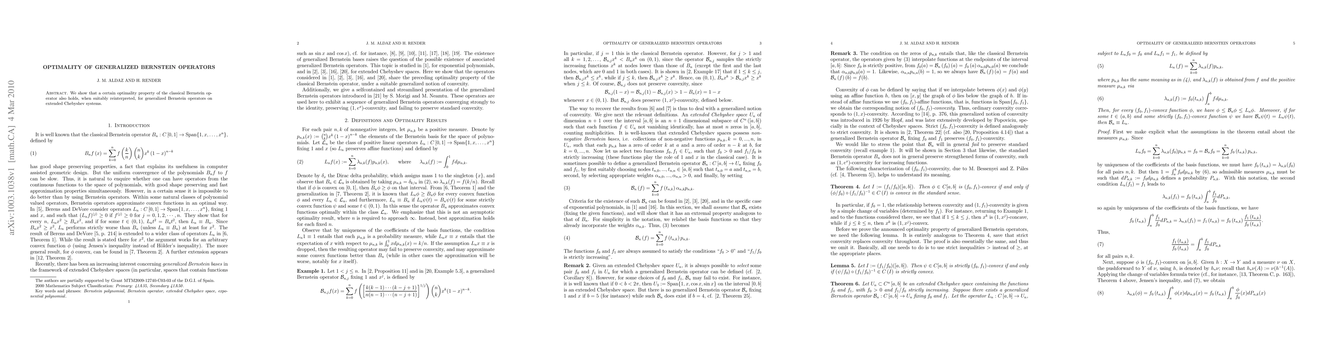 Summary: This paper demonstrates that the classical Bernstein operator's optimal approximation property extends to generalized Bernstein operators when applied to extended Chebyshev systems. The study highlights the preservation of this optimality under suitable reinterpretation.