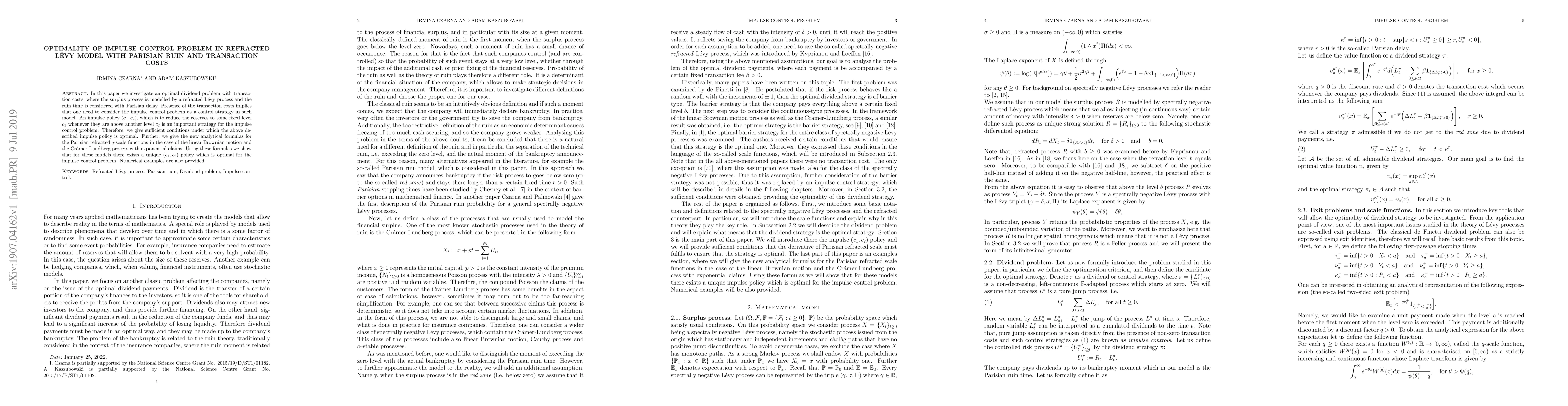 This paper explores an optimal dividend strategy in a refracted Lévy model with Parisian ruin and transaction costs, focusing on impulse control policies. It provides sufficient conditions for the optimality of a specific impulse policy and derives new analytical formulas for Parisian refracted $q$-scale functions, demonstrating the existence of a unique optimal $(c_1, c_2)$ policy for linear Brownian motion and the Cramer-Lundberg process.