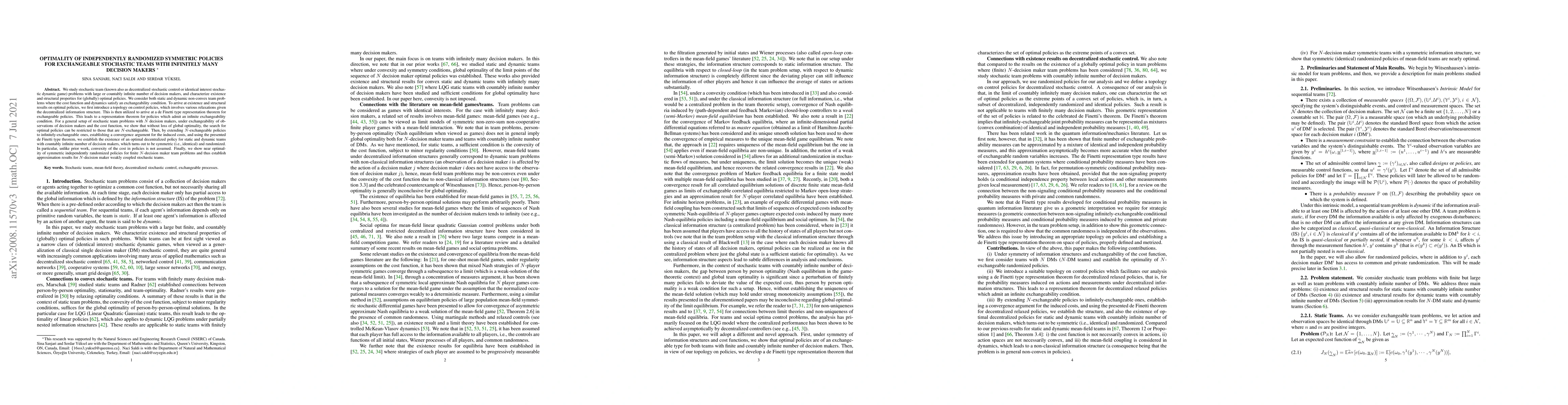 This paper investigates optimal policies for stochastic team problems with infinitely many decision makers, proving the existence of optimal decentralized policies under exchangeability conditions. It demonstrates that optimal policies can be restricted to $N$-exchangeable, and ultimately infinitely-exchangeable, symmetric and randomized policies, without requiring policy convexity.