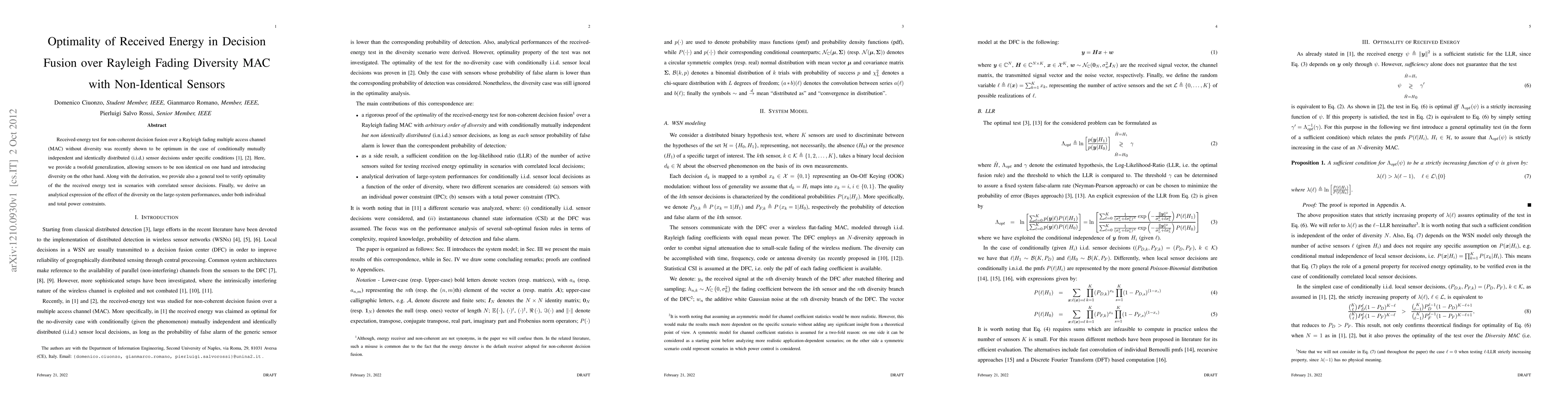 Received-energy test for non-coherent decision fusion over a Rayleigh fading multiple access channel (MAC) without diversity was recently shown to be optimum in the case of conditionally mutually independent and identically distributed (i.i.d.) sensor decisions under specific conditions [1], [2]. Here, we provide a twofold generalization, allowing sensors to be non identical on one hand and introducing diversity on the other hand. Along with the derivation, we provide also a general tool to verify optimality of the the received energy test in scenarios with correlated sensor decisions. Finally, we derive an analytical expression of the effect of the diversity on the large-system performances, under both individual and total power constraints.