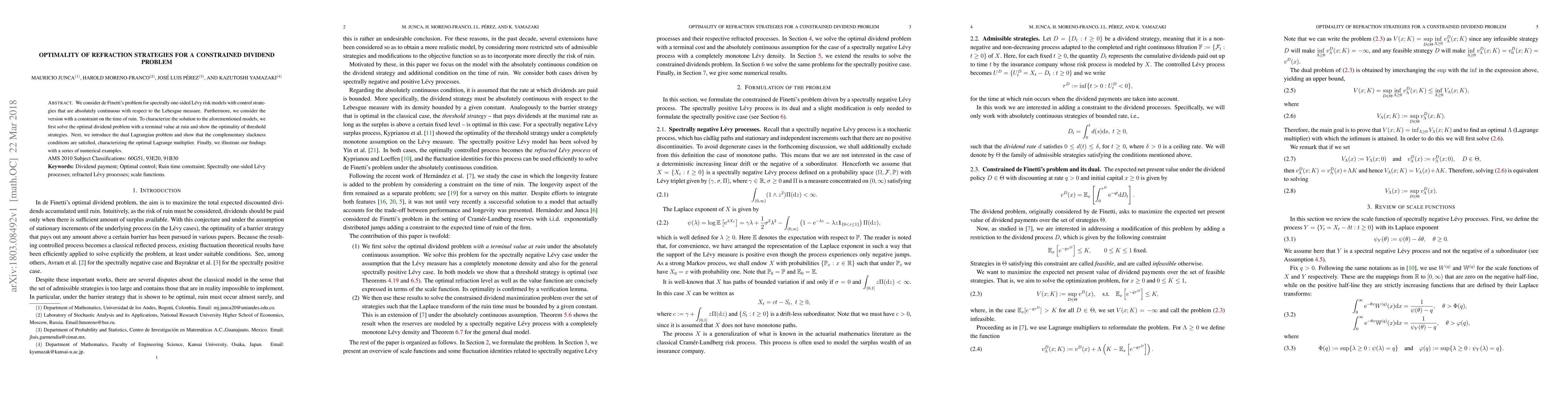 We consider de Finetti's problem for spectrally one-sided L\'evy risk models with control strategies that are absolutely continuous with respect to the Lebesgue measure. Furthermore, we consider the version with a constraint on the time of ruin. To characterize the solution to the aforementioned models, we first solve the optimal dividend problem with a terminal value at ruin and show the optimality of threshold strategies. Next, we introduce the dual Lagrangian problem and show that the complementary slackness conditions are satisfied, characterizing the optimal Lagrange multiplier. Finally, we illustrate our findings with a series of numerical examples.