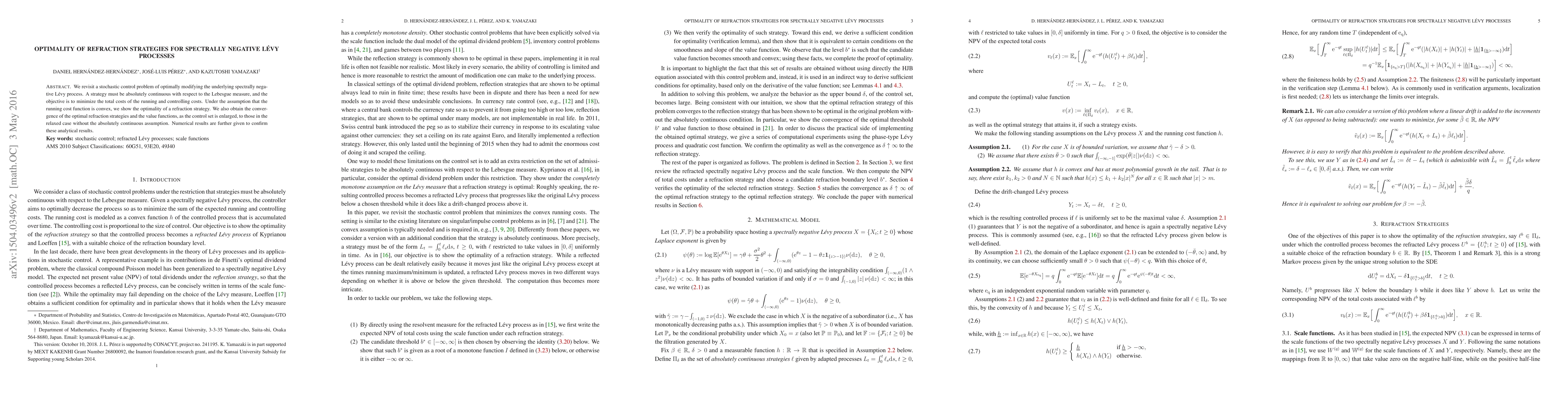 This paper explores optimal strategies for modifying spectrally negative Lévy processes to minimize running and controlling costs, proving the optimality of refraction strategies under convex running cost conditions. It also demonstrates convergence of optimal strategies as the control set expands, supported by numerical results.