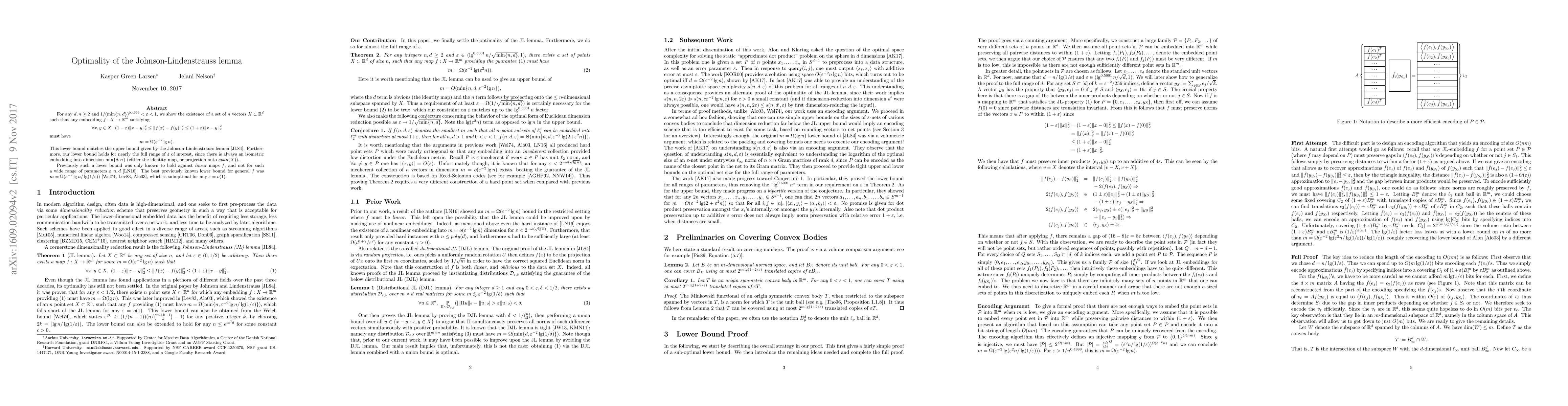 For any integers $d, n \geq 2$ and $1/({\min\{n,d\}})^{0.4999} < \varepsilon<1$, we show the existence of a set of $n$ vectors $X\subset \mathbb{R}^d$ such that any embedding $f:X\rightarrow \mathbb{R}^m$ satisfying $$ \forall x,y\in X,\ (1-\varepsilon)\|x-y\|_2^2\le \|f(x)-f(y)\|_2^2 \le (1+\varepsilon)\|x-y\|_2^2 $$ must have $$ m = \Omega(\varepsilon^{-2} \lg n). $$ This lower bound matches the upper bound given by the Johnson-Lindenstrauss lemma [JL84]. Furthermore, our lower bound holds for nearly the full range of $\varepsilon$ of interest, since there is always an isometric embedding into dimension $\min\{d, n\}$ (either the identity map, or projection onto $\mathop{span}(X)$). Previously such a lower bound was only known to hold against linear maps $f$, and not for such a wide range of parameters $\varepsilon, n, d$ [LN16]. The best previously known lower bound for general $f$ was $m = \Omega(\varepsilon^{-2}\lg n/\lg(1/\varepsilon))$ [Wel74, Lev83, Alo03], which is suboptimal for any $\varepsilon = o(1)$.