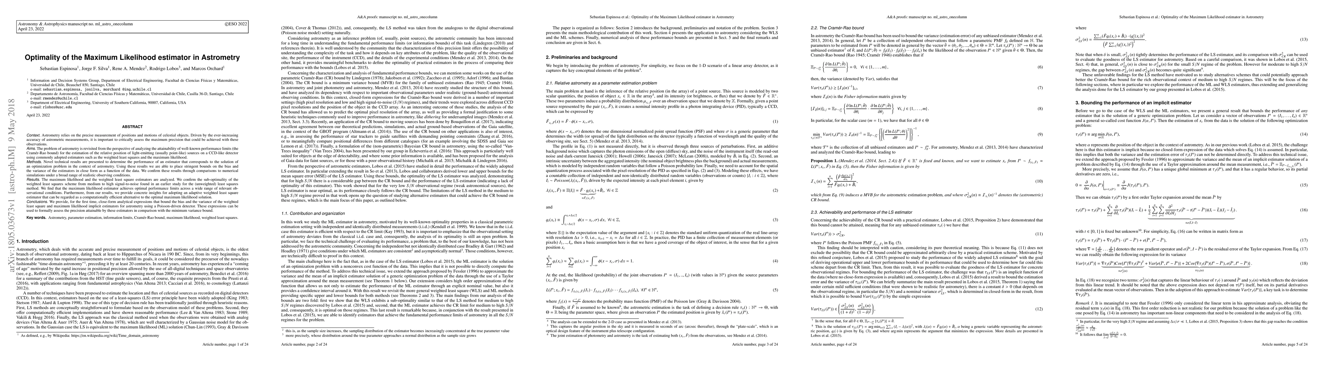 This paper investigates the optimality of the maximum likelihood estimator in astrometry, confirming its performance limits against the Cramer-Rao bound. It finds that the maximum likelihood estimator achieves optimal precision, while the weighted least squares estimator is sub-optimal, especially at medium to high signal-to-noise ratios.