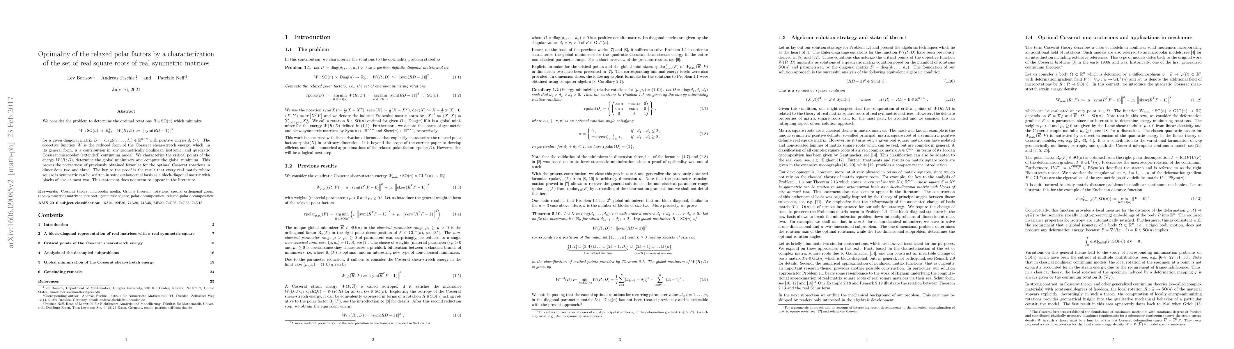 This research paper presents a characterization of real square roots of symmetric matrices, used to prove optimality of rotations in Cosserat micropolar models. It determines global minimizers for minimizing Cosserat shear-stretch energy, confirming previous formulae for dimensions two and three.