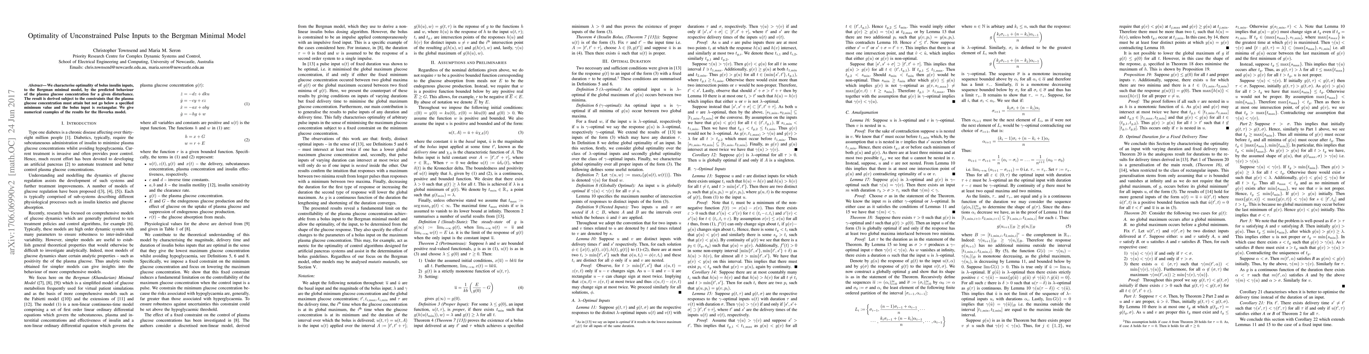 We characterise optimality of bolus insulin inputs, to the Bergman minimal model, by the predicted behaviour of the plasma glucose concentration for a given disturbance. The result is derived subject to the constraints that the plasma glucose concentration must attain but not go below a specified minimum value and the bolus input is rectangular. We give numerical examples of the results for the Hovorka model.