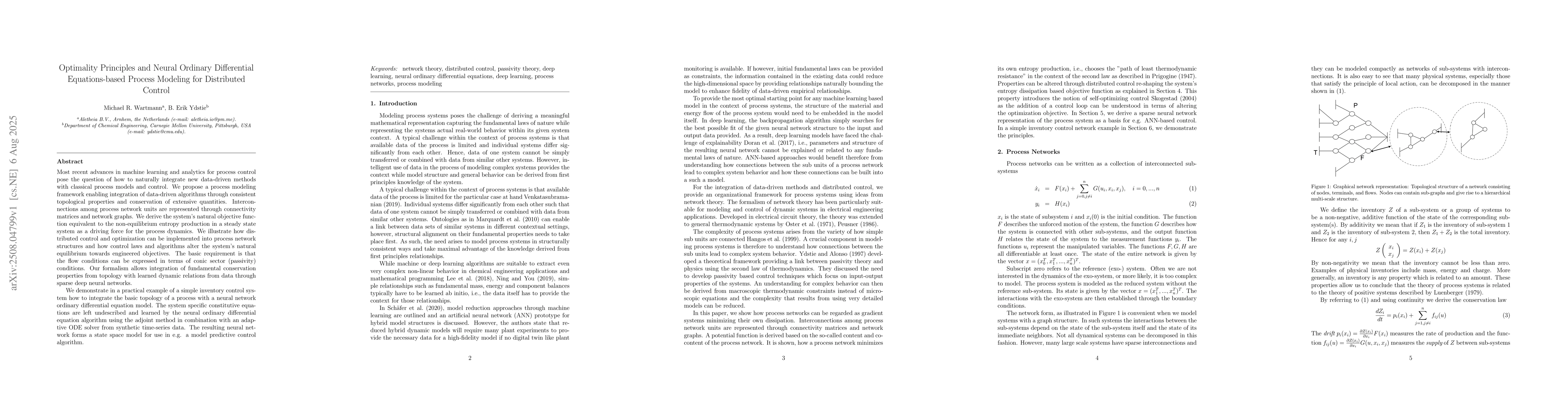 Most recent advances in machine learning and analytics for process control pose the question of how to naturally integrate new data-driven methods with classical process models and control. We propose a process modeling framework enabling integration of data-driven algorithms through consistent topological properties and conservation of extensive quantities. Interconnections among process network units are represented through connectivity matrices and network graphs. We derive the system's natural objective function equivalent to the non-equilibrium entropy production in a steady state system as a driving force for the process dynamics. We illustrate how distributed control and optimization can be implemented into process network structures and how control laws and algorithms alter the system's natural equilibrium towards engineered objectives. The basic requirement is that the flow conditions can be expressed in terms of conic sector (passivity) conditions. Our formalism allows integration of fundamental conservation properties from topology with learned dynamic relations from data through sparse deep neural networks. We demonstrate in a practical example of a simple inventory control system how to integrate the basic topology of a process with a neural network ordinary differential equation model. The system specific constitutive equations are left undescribed and learned by the neural ordinary differential equation algorithm using the adjoint method in combination with an adaptive ODE solver from synthetic time-series data. The resulting neural network forms a state space model for use in e.g. a model predictive control algorithm.