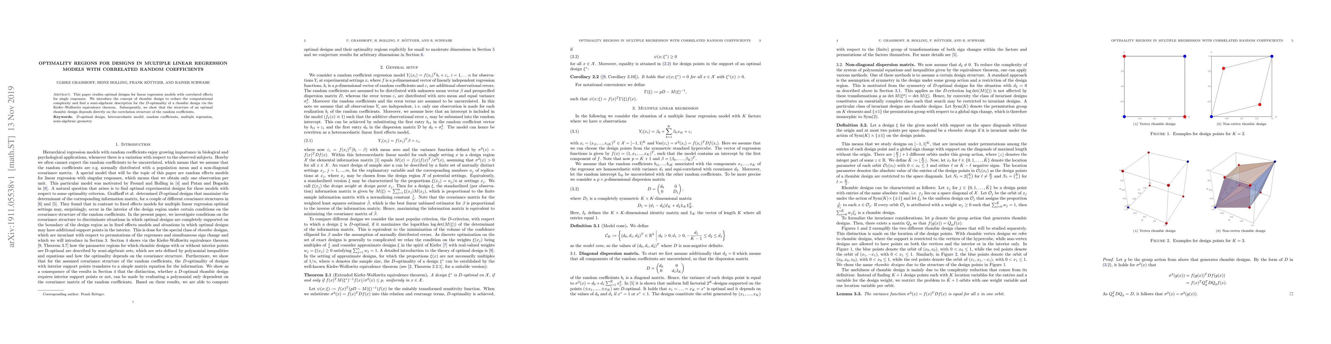 This paper explores optimal designs for linear regression models with correlated random coefficients, introducing rhombic designs to simplify computations and deriving a semi-algebraic description for D-optimality using the Kiefer-Wolfowitz equivalence theorem. The study reveals that the optimal rhombic design's structure is directly influenced by the correlation among the random coefficients.