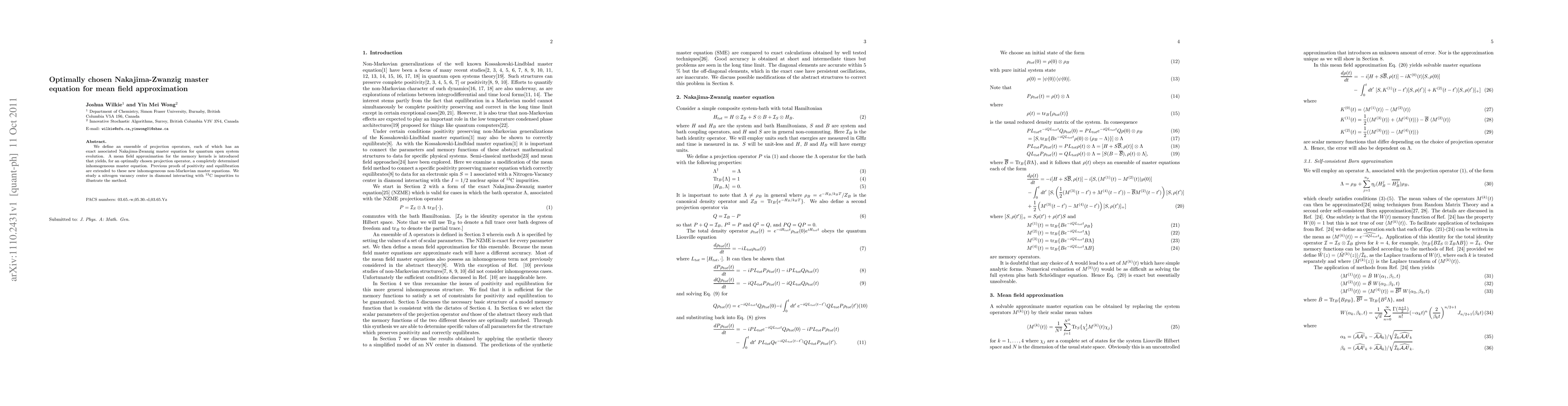This paper presents a method to derive an optimally chosen Nakajima-Zwanzig master equation for quantum open systems using a mean field approximation, ensuring positivity and equilibration. The approach is demonstrated through a study of a nitrogen vacancy center in diamond interacting with 13C impurities.