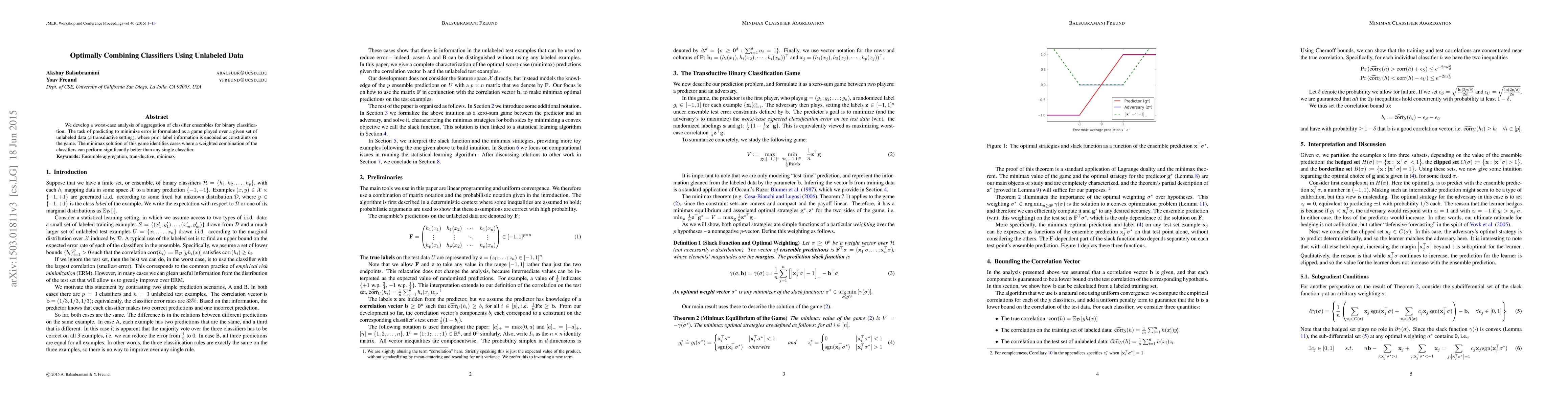 This paper proposes a worst-case analysis for combining classifier ensembles in a transductive setting using unlabeled data, identifying optimal weighted combinations that outperform individual classifiers by formulating the prediction task as a minimax game.
