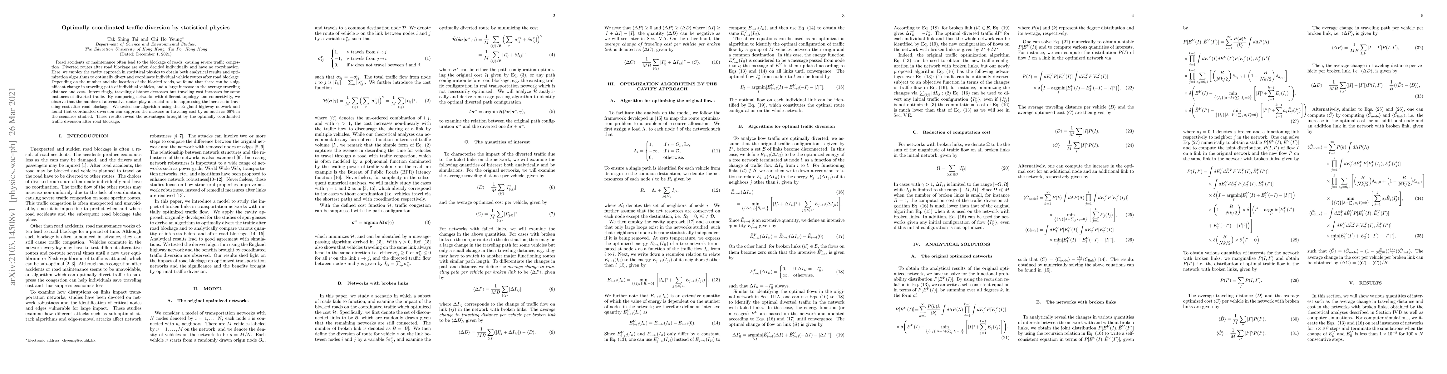 This paper uses statistical physics techniques to develop an optimization algorithm for coordinating traffic diversion after road blockages, showing that such coordinated diversion can reduce travel cost increases by up to 66% in tested scenarios. The study highlights the importance of alternative routes in minimizing travel cost increases.