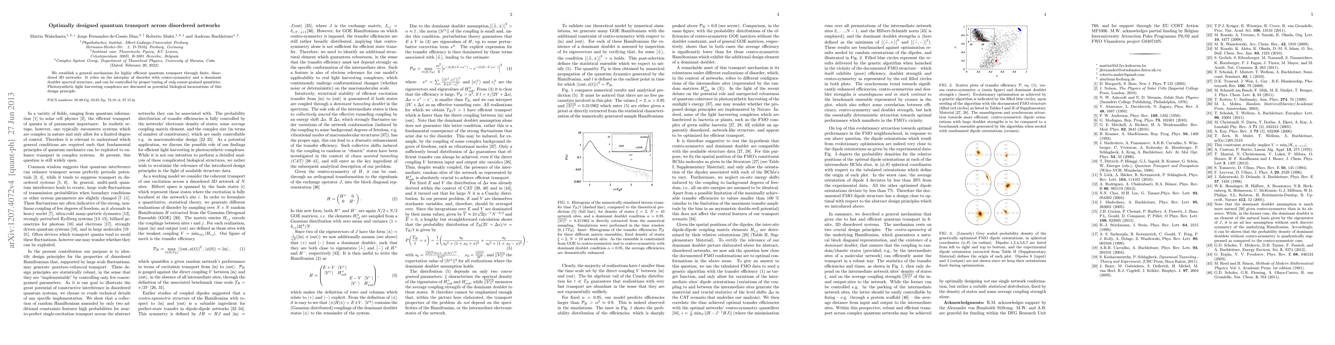 This paper proposes a mechanism for efficient quantum transport in disordered 3D networks, leveraging disorder, centro-symmetry, and a doublet spectral structure, with control via coarse-grained parameters. It also suggests photosynthetic complexes as biological examples of this design principle.