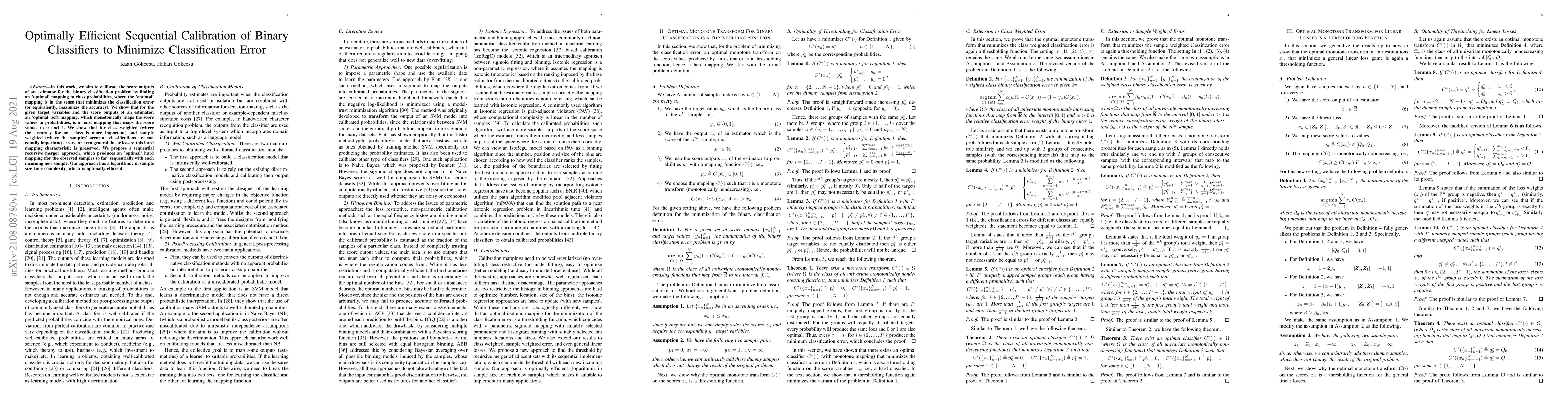 This paper proposes a method to optimize binary classifier calibration for minimizing classification error. It presents a sequential approach with a logarithmic time complexity.
