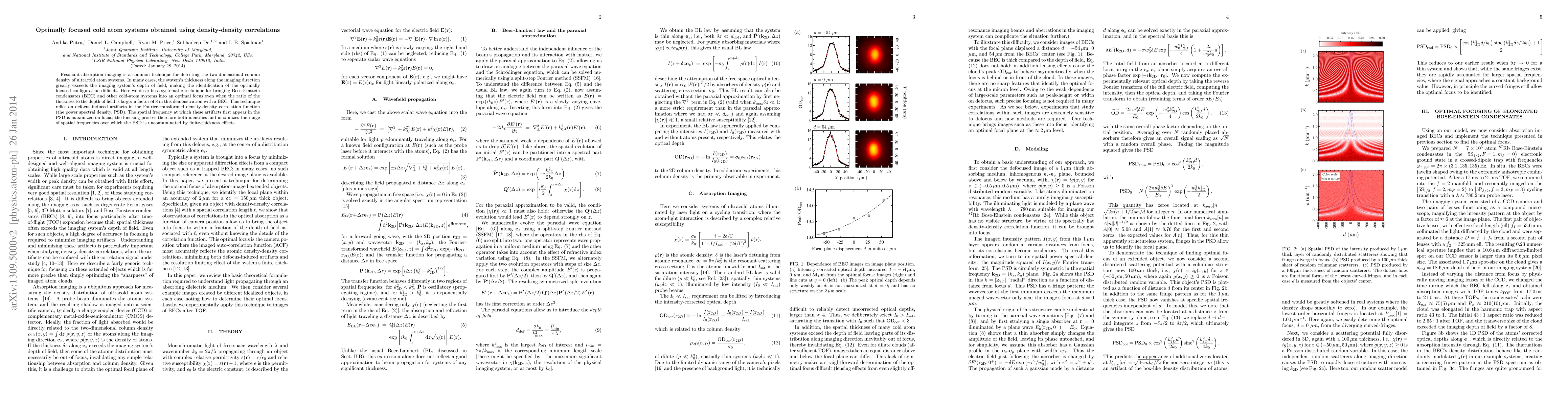 This paper presents a method to optimally focus cold atom systems, such as Bose-Einstein condensates, using density-density correlations. The technique leverages defocus-induced artifacts in the power spectral density to identify and maximize the optimal focus, even when the system's thickness is much larger than the imaging depth of field.